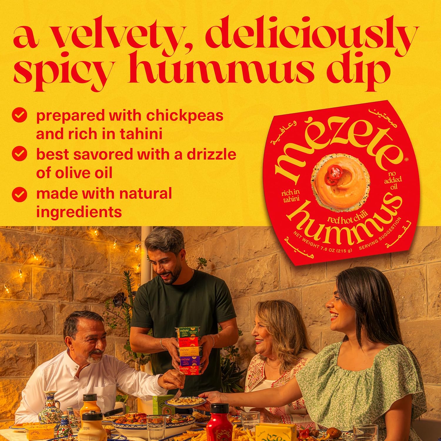 About this item TRADITIONAL RECIPE - Experience the authentic taste of tahini-rich hummus with Mezete. Inspired by a legacy that began in 1926, we're committed to bringing the true flavors of the Middle East to the world, preserving the timeless essence of tradition in every bite. HOT N SPICY - Enjoy the rich velvety taste of hummus with an added burst of fiery red chilis. This spicy vegan hummus is perfect for spicy food lovers. ALL NATURAL GOODNESS - Made with simple, wholesome ingredients—no preservatives, no added oil, no additives. Just pure flavor you can feel good about! PERFECT FOR CHARCUTERIE - Mezete Hummus adds a creamy, savory touch to any charcuterie board. Pair it with cheeses, cured meats, fresh veggies, or crunchy crackers—for a flavorful, Middle Eastern twist. SHELF STABLE - Being shelf stable it can be stored in your pantry without any refrigeration for a long time. Just take it out of your pantry and enjoy gourmet dips whenever you desire. See more product details,TRADITIONAL RECIPE - Experience the authentic taste of tahini-rich hummus with Mezete. Inspired by a legacy that began in 1926, we're committed to bringing the true flavors of the Middle East to the world, preserving the timeless essence of tradition in every bite,HOT N SPICY - Enjoy the rich velvety taste of hummus with an added burst of fiery red chilis. This spicy vegan hummus is perfect for spicy food lovers,ALL NATURAL GOODNESS - Made with simple, wholesome ingredients—no preservatives, no added oil, no additives. Just pure flavor you can feel good about!,PERFECT FOR CHARCUTERIE - Mezete Hummus adds a creamy, savory touch to any charcuterie board. Pair it with cheeses, cured meats, fresh veggies, or crunchy crackers—for a flavorful, Middle Eastern twist,SHELF STABLE - Being shelf stable it can be stored in your pantry without any refrigeration for a long time. Just take it out of your pantry and enjoy gourmet dips whenever you desire