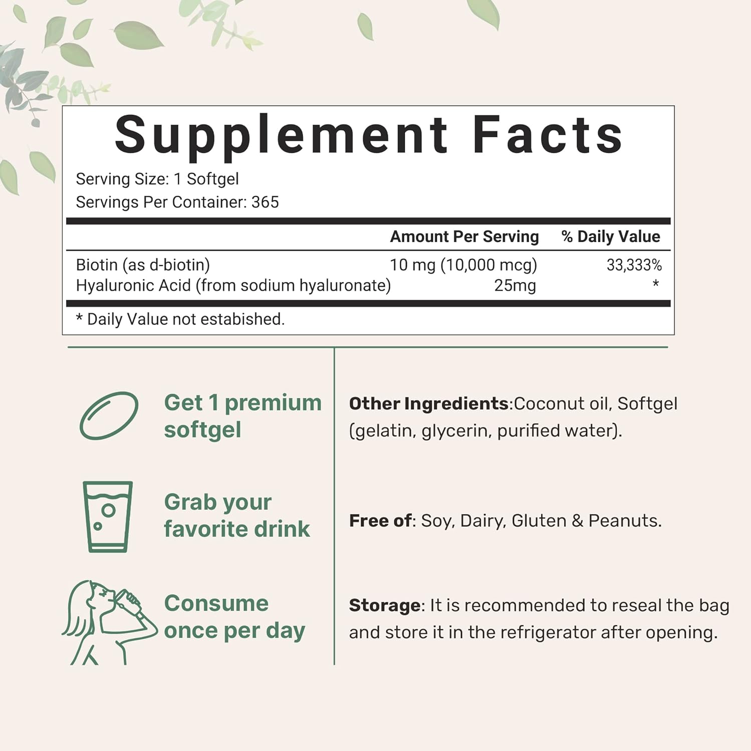 2 >A powerful once-daily biotin 10000mcg supplement that is derived from premium D-Biotin, as well as containing 25mg hyaluronic acid from sodium hyaluronate. Every pouch offers a full year supply that only takes a single softgel serving size to promote overall confidence, inside and out