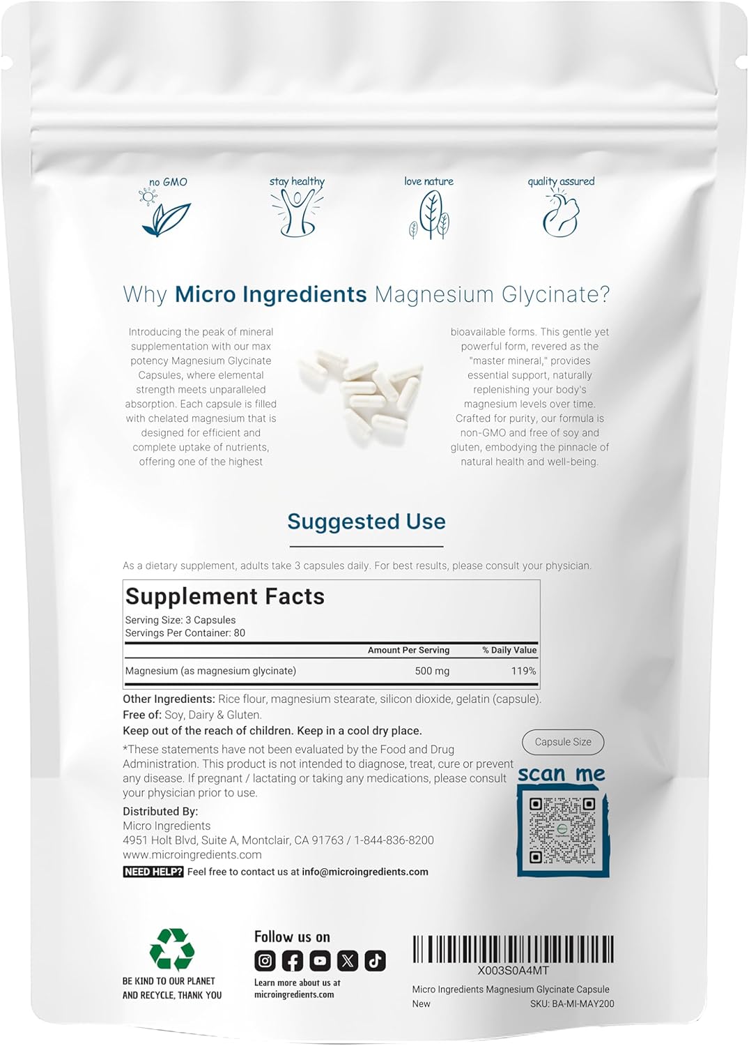 240 Capsules Per Pouch That Delivers An Extra Strength 500Mg Dose Of Pure Magnesium Glycinate. Every 3 Capsule Serving Size Provides An 80 Day Supply And Promotes Benefits For Bones And Heart, As Well As Supporting Calmness