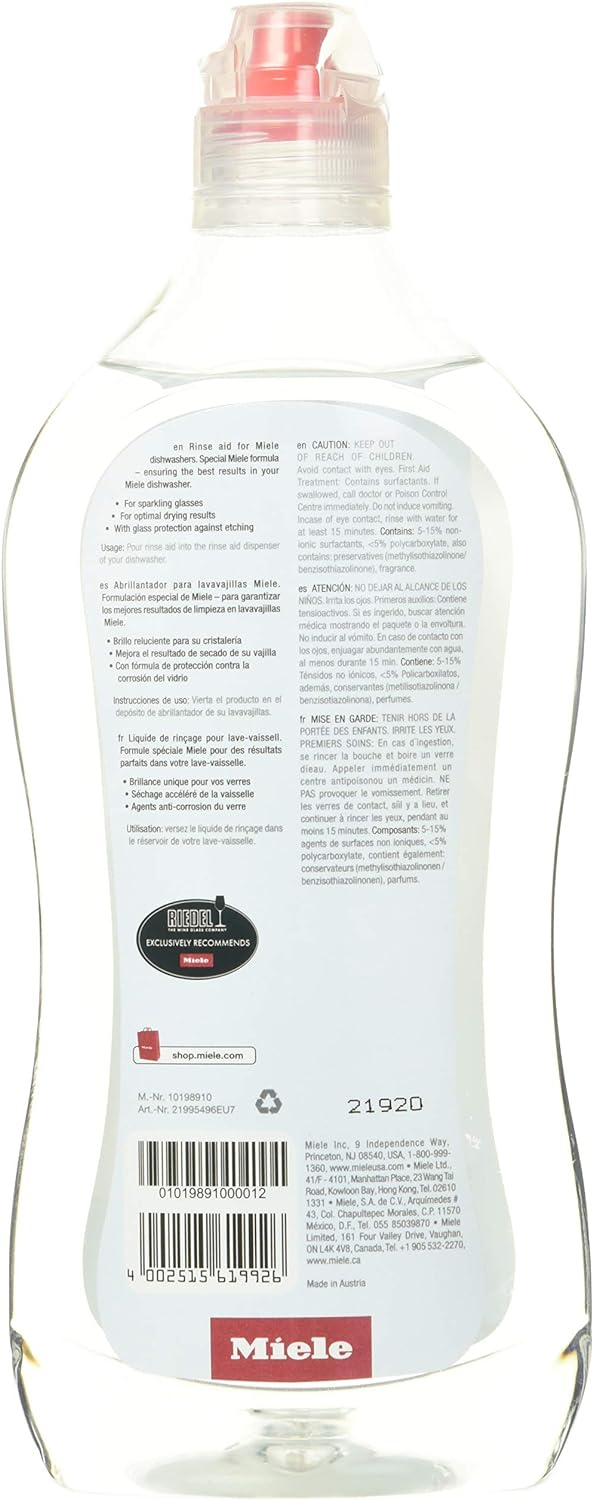 Miele Rinse Aid: This product complements dishwasher detergent by making rinsing during the cycle more gentle and thorough, leaving your kitchenware shinier but also protected against long-term wear10Optimum drying and protection: Formulated to help dry dishes even after dishwasher use, rinsing without leaving watermarks, limescale or odors, as well as preventing glass corrosion10Sparkling shine: The seamless interaction between the rinse aid and dishwasher alongside the detergent ensures your glasses are treated carefully for reliable protection and a sparkling finish10Miele quality: Miele dishwasher products are designed for reliable, high-quality results that will help make cleaning your dishes and kitchen utensils easier and more comfortable10Items delivered: 1 x Miele Dishwasher Rinse Aid with easy-pour bottle with dosing cap made from 100% recycled plastic, 17 oz