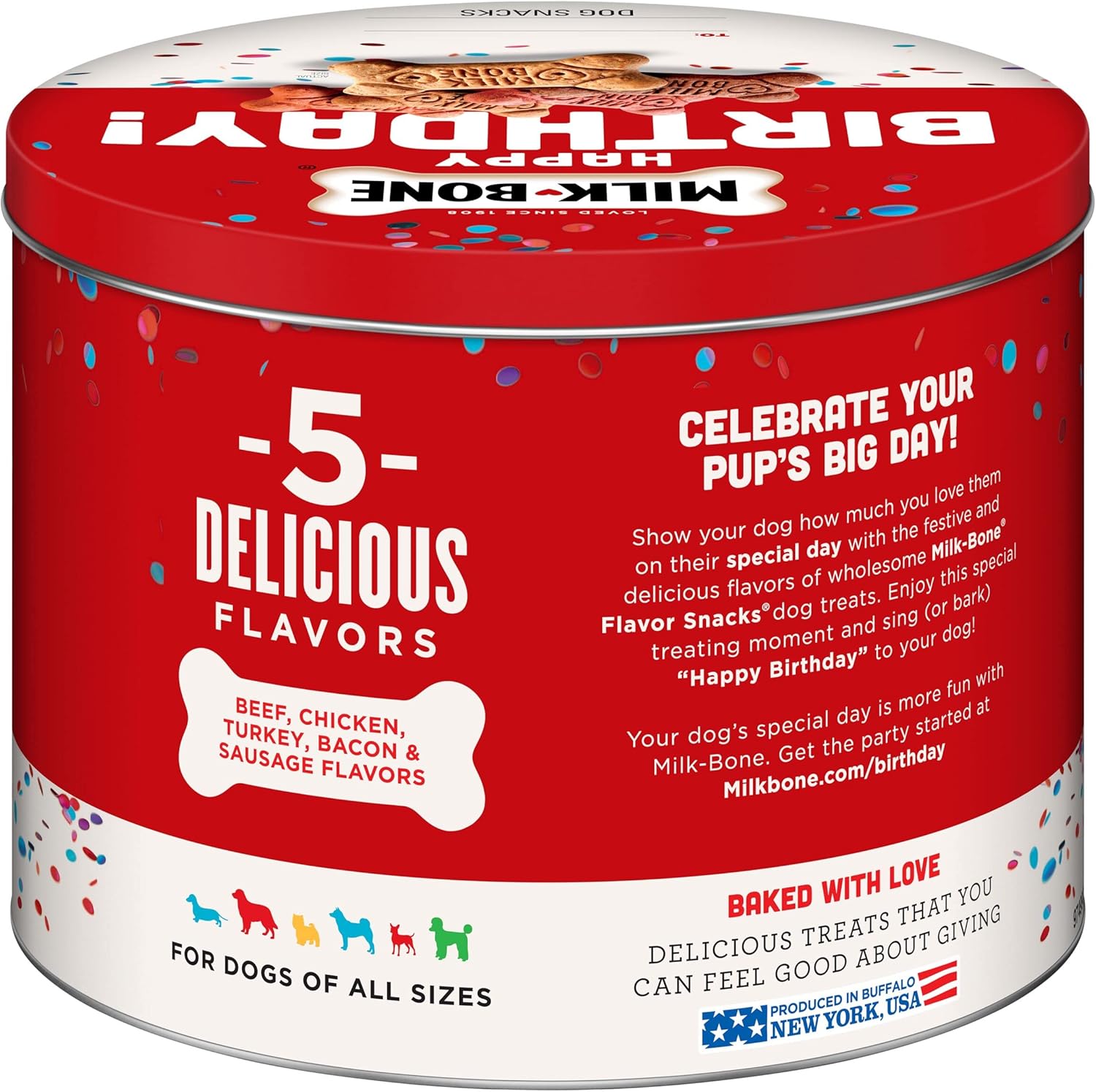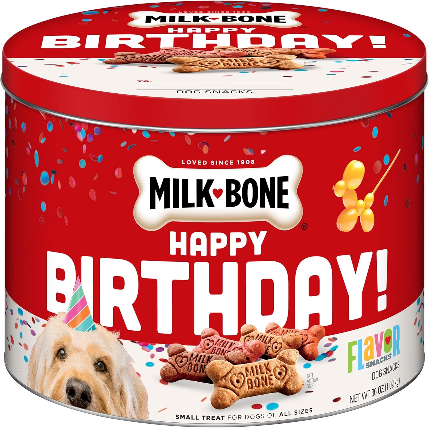 Celebrate Your Pup’S Big Day With Milk-Bone Flavor Snacks Small Dog Treats In A Keepsake Birthday Tin. It’S The Most Mouthwatering Of Dog Birthday Gifts — Tasty, Wholesome Dog Biscuits In Five Delicious Flavors: Chicken, Bacon, Beef, Turkey And Sausage. These Crunchy Dog Treats Are Baked With Love For Dogs Of All Sizes, And Their Crunchy Texture Helps Freshen Breath And Reduce Tartar Build-Up — Perfect For Sloppy Doggie Kisses. Plus, They’Re Made With 12 Vitamins And Minerals So That You Can Feel Good About Feeding Them To Your Buddy. This Assortment Of Milk-Bone Dog Snacks Can Help Keep The Good Times Going On Your Dog’S Birthday And Beyond. So, Grab A Tin, And Let The Party Begin!