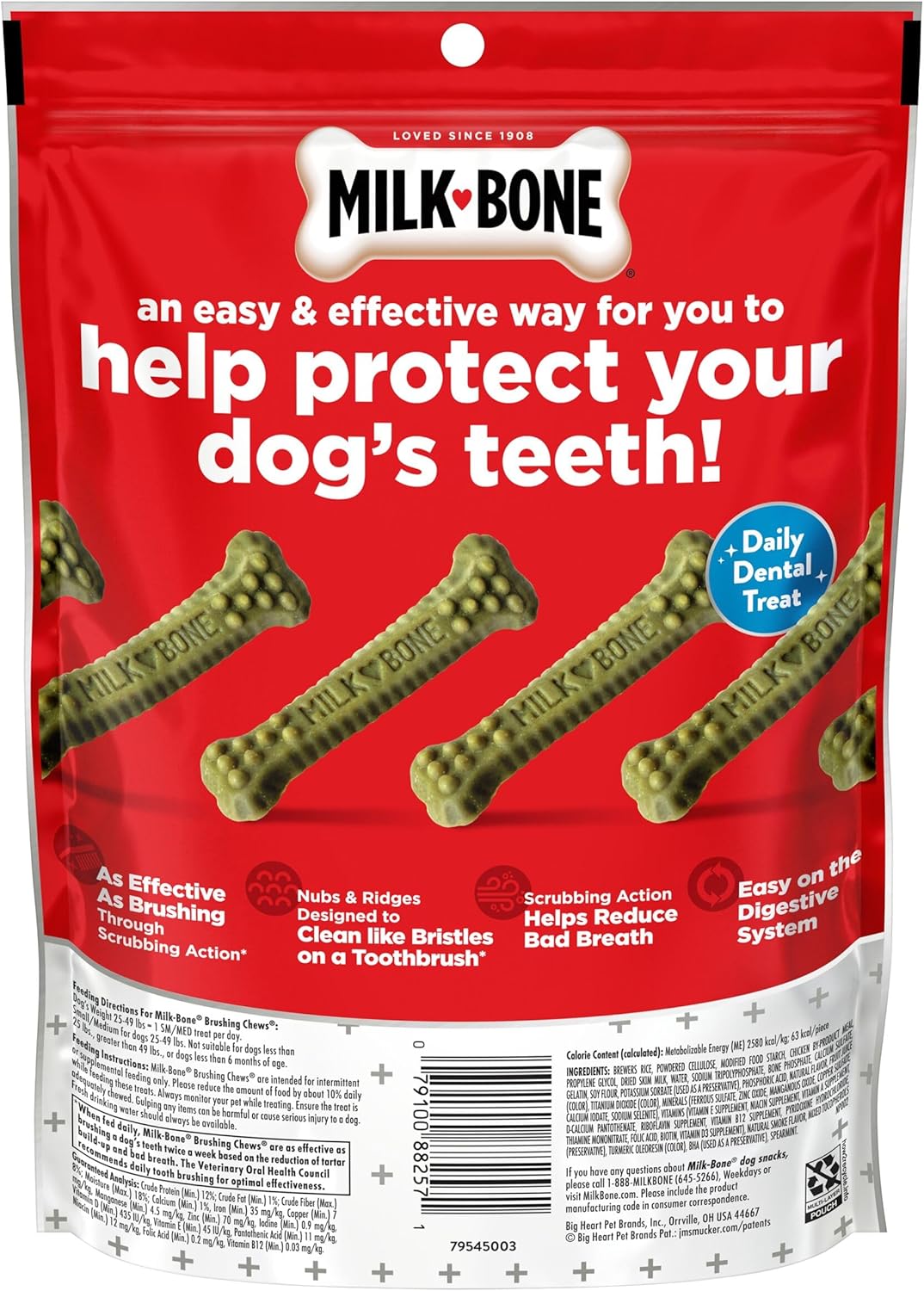 If You Love Getting Kisses From Your Dog, Give Them Milk-Bone Brushing Chews Daily Dental Dog Treats To Help Freshen Their Breath. While Your Canine Companion Enjoys These Fresh Breath Dog Treats, The Scrubbing Action Helps To Clean Their Teeth And Reduce Bad Breath. The Twist Design Helps Reduce Tartar Buildup, While The Nubs And Ridges Help Maintain Healthy Gums. These Dog Chews Are Also Formulated With Calcium To Help Support Strong Bones And Teeth, And They Have A Minty Taste Your Dog Will Love. Plus, They Contain No Fillers Or Artificial Flavors And Are Easy To Digest. Stock Up Now For An Easy And Effective Way To Help Protect Your Dog’S Teeth