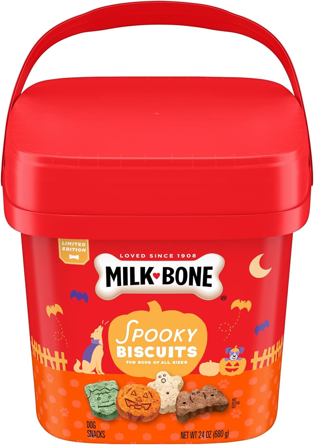 Contains One (1) 24-Ounce Pail Of Milk-Bone Spooky Biscuits Halloween Dog Treats