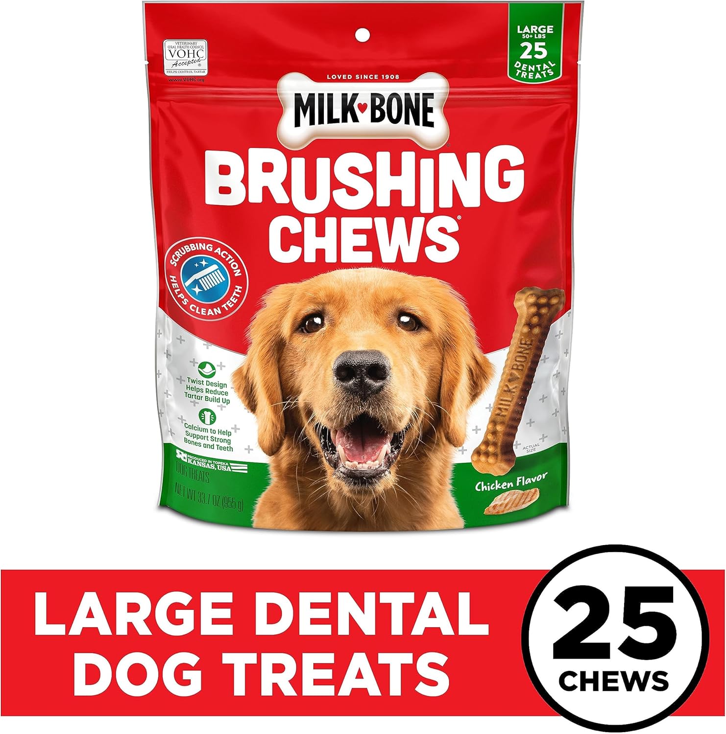 Contains One (1) 33.7-Ounce Bag Of Large Dog Dental Treats (25 Bones Total)10Chicken-Flavored Large Dog Treats For Dogs Over 50 Lbs. And Six Months Of Age10Scrubbing Action Helps Clean Teeth And Freshen Breath, Reduce Tartar Buildup, And Maintain Healthy Gums10Formulated With Calcium To Help Support Strong Bones And Teeth10No Artificial Flavors And No Fillers10If You Love Getting Up Close And Personal With Your Dog, You Can Help Freshen Their Breath With Milk-Bone Brushing Chews Daily Dental Dog Treats. While Your Canine Companion Enjoys These Delicious Dog Chews, The Scrubbing Action Helps Clean Their Teeth And Reduce Bad Breath. The Twist Design Helps Reduce Tartar Buildup, While The Nubs And Ridges Help Maintain Healthy Gums. These Dog Dental Treats Are Also Formulated With Calcium To Help Support Strong Bones And Teeth, And They Have A Tasty Chicken Flavor Your Dog Will Love. Plus, They Contain No Fillers Or Artificial Flavors And Are Easy To Digest. Stock Up Now For An Easy And Effective Way To Help Protect Your Dog’S Teeth