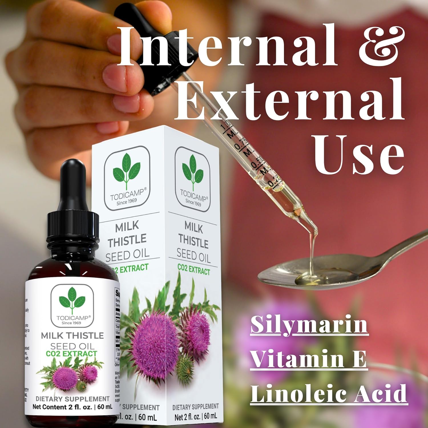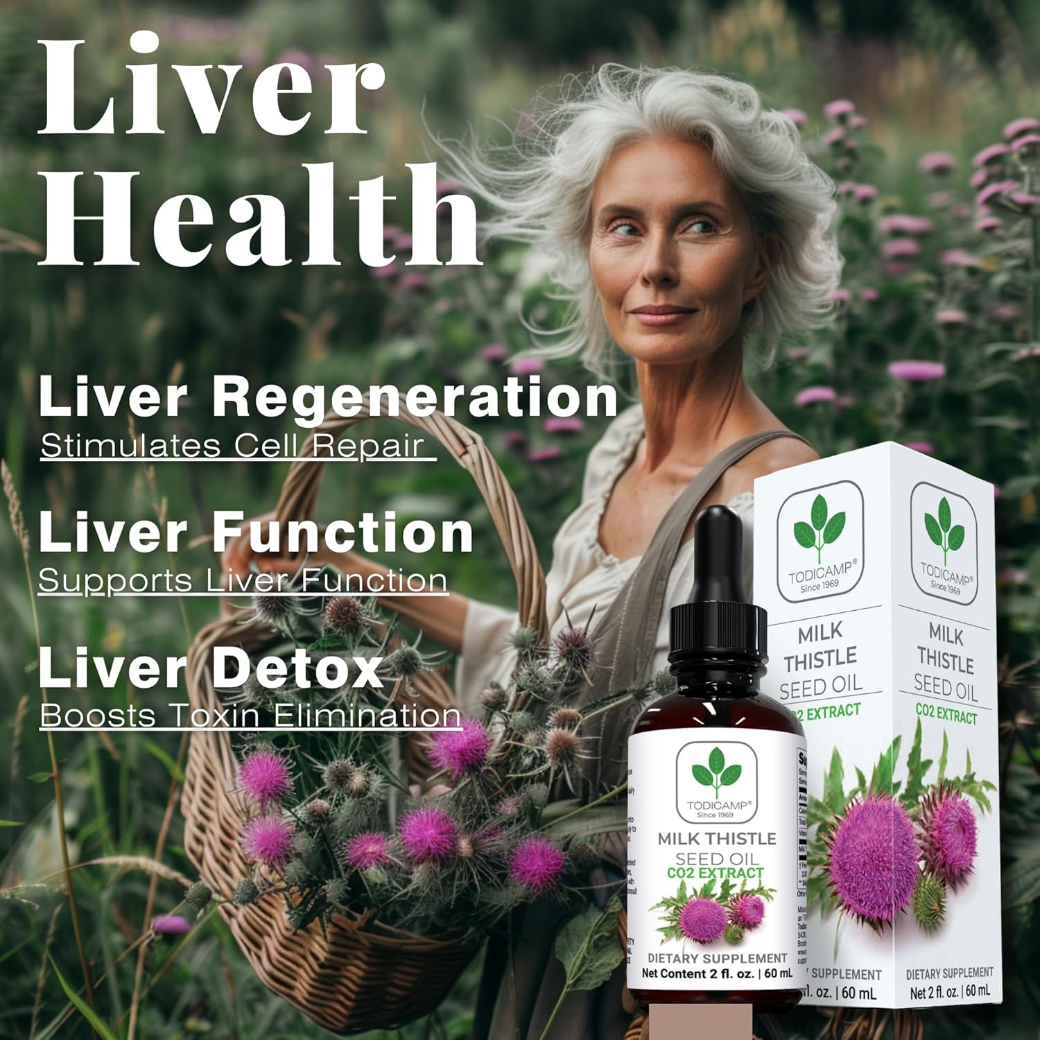 About this item High-Potency CO2 Extracted Milk Thistle Oil β Unlike traditional alcohol-based tinctures, our milk thistle drops supplement is crafted using an advanced CO2 extraction method, ensuring a solvent-free, pure, and bioavailable formula. This maximizes absorption and effectiveness, delivering a highly concentrated dose of milk thistle 1000mg equivalent per serving. No Fillers or Additives β Made with only organic milk thistle seed oil, this formula contains no artificial preservatives, alcohol, or additives. Our organics milk thistle tincture is non-GMO, vegan-friendly, and gluten-free, making it an ideal choice for those looking for natural liver support in an easy-to-use liquid form. Liver Support β Formulated with high-potency silymarin milk thistle, our extract helps promote liver health, detoxification, and overall wellness. This liquid milk thistle supplement is made with a cold-pressed CO2 extraction process to preserve the highest purity and potency of active compounds. Fast-Absorbing Liquid Milk Thistle Supplement β Unlike milk thistle capsules or tablets, our milk thistle liquid form allows for faster absorption and better bioavailability. Simply take the drops or mix it with water or juice for easy daily consumption, supporting your bodyβs natural detox process and liver health. Trusted Herbal Supplement Since 1969 β Todicamp is committed to delivering high-quality, plant-based wellness solutions. Our milk thistle herbal supplement is produced following strict quality standards to ensure potency, purity, and effectiveness. Whether for daily detox, liver care, or overall health, this liquid milk thistle oil is an essential addition to your wellness routine. See more product details,High-Potency CO2 Extracted Milk Thistle Oil β Unlike traditional alcohol-based tinctures, our milk thistle drops supplement is crafted using an advanced CO2 extraction method, ensuring a solvent-free, pure, and bioavailable formula. This maximizes absorption and effectiveness, delivering a highly concentrated dose of milk thistle 1000mg equivalent per serving,No Fillers or Additives β Made with only organic milk thistle seed oil, this formula contains no artificial preservatives, alcohol, or additives. Our organics milk thistle tincture is non-GMO, vegan-friendly, and gluten-free, making it an ideal choice for those looking for natural liver support in an easy-to-use liquid form,Liver Support β Formulated with high-potency silymarin milk thistle, our extract helps promote liver health, detoxification, and overall wellness. This liquid milk thistle supplement is made with a cold-pressed CO2 extraction process to preserve the highest purity and potency of active compounds,Fast-Absorbing Liquid Milk Thistle Supplement β Unlike milk thistle capsules or tablets, our milk thistle liquid form allows for faster absorption and better bioavailability. Simply take the drops or mix it with water or juice for easy daily consumption, supporting your bodyβs natural detox process and liver health,Trusted Herbal Supplement Since 1969 β Todicamp is committed to delivering high-quality, plant-based wellness solutions. Our milk thistle herbal supplement is produced following strict quality standards to ensure potency, purity, and effectiveness. Whether for daily detox, liver care, or overall health, this liquid milk thistle oil is an essential addition to your wellness routine