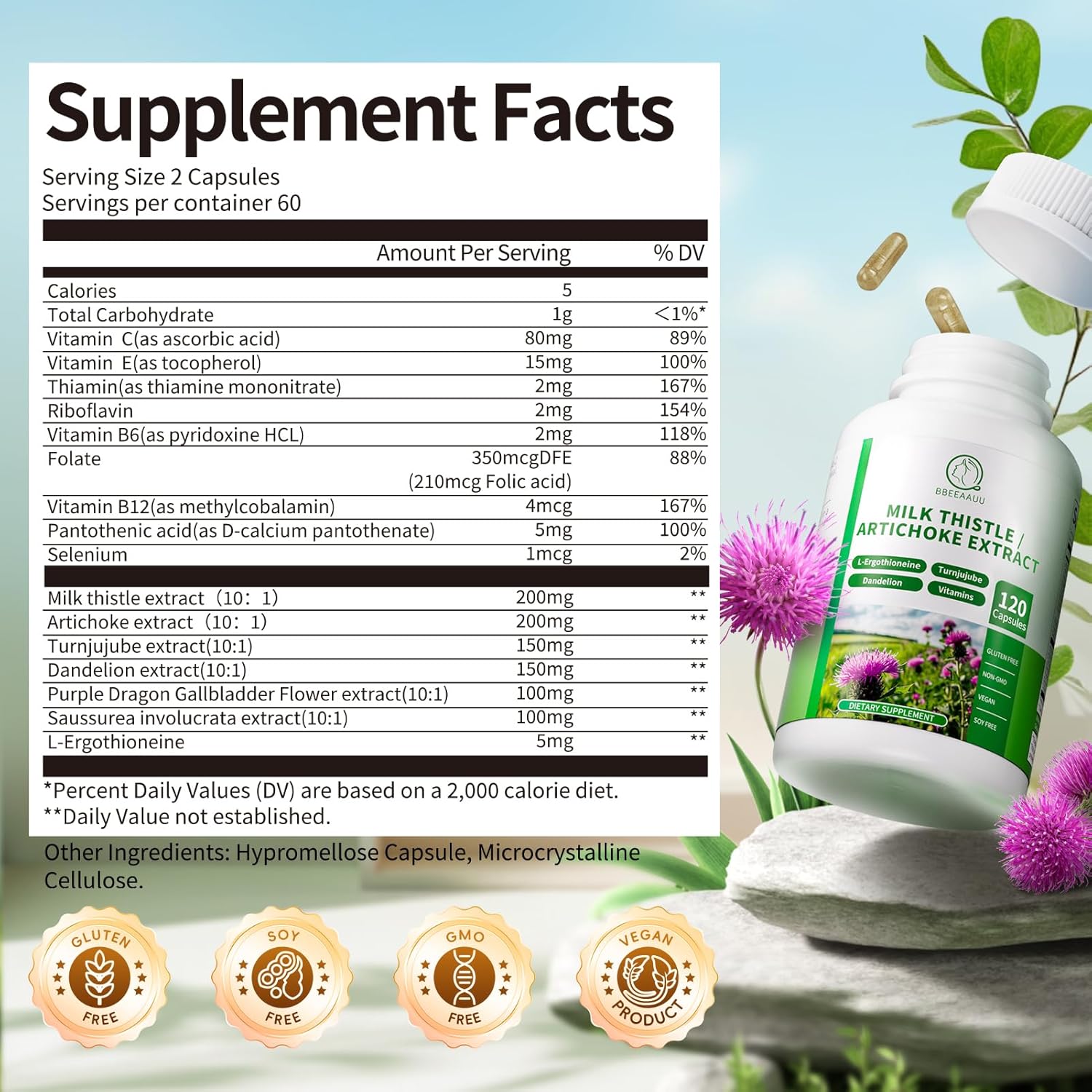 About this item Comprehensive 16-in-1 Formula: Our unique milk thistle capsules are enriched with herbal extracts such as milk thistle, artichoke, turnjujube, dandelion, purple dragon gallbladder flower, and saussurea involucrata. Powerful Antioxidant: Our liver supplement capsules are a supportive supplement that helps nourish the liver. Herbal extracts such as milk thistle, artichoke and turnjujube are rich in antioxidants that fight free radicals, protect cells from oxidative stress and promote overall liver wellness. Specially Added 5mg L-Ergothioneine: The added L-Ergothioneine to effectively care for liver cells. L-Ergothioneine is a natural antioxidant that excels in protecting cells from oxidative stress. Superior Quality: GMO-Free and Soy-Free. Every product manufactured by BBEEAAUU undergoes a rigorous process to ensure purity, potency and integrity. Easy to Take: 2 Capsules Per Serving, 60 Days Supply: Take 2 capsules daily, preferably with a meal, or as directed by your healthcare professional. 1 bottle for 60 days' supply. Ingredient: Milk thistle extract?10:1?200mg, Artichoke extract?10:1?200mg, Turnjujube extract(10:1) 150mg, Dandelion extract(10:1) 150mg, Purple Dragon Gallbladder Flower extract(10:1) 100mg, Saussurea involucrata extract(10:1) 100mg, L-Ergothioneine 5mg, Vitamin C(as ascorbic acid) 80mg, Vitamin E(as tocopherol) 15mg, Thiamin(as thiamine mononitrate) 2mg, Riboflavin 2mg, Vitamin B6(as pyridoxine HCL) 2mg, Folate 350mcgDFE, Vitamin B12(as methylcobalamin) 4mcg, Pantothenic acid(as D-calcium pantothenate) 5mg, Selenium 1mcg. โบ See more product details,Comprehensive 16-in-1 Formula: Our unique milk thistle capsules are enriched with herbal extracts such as milk thistle, artichoke, turnjujube, dandelion, purple dragon gallbladder flower, and saussurea involucrata,Powerful Antioxidant: Our liver supplement capsules are a supportive supplement that helps nourish the liver. Herbal extracts such as milk thistle, artichoke and turnjujube are rich in antioxidants that fight free radicals, protect cells from oxidative stress and promote overall liver wellness,Specially Added 5mg L-Ergothioneine: The added L-Ergothioneine to effectively care for liver cells. L-Ergothioneine is a natural antioxidant that excels in protecting cells from oxidative stress,Superior Quality: GMO-Free and Soy-Free. Every product manufactured by BBEEAAUU undergoes a rigorous process to ensure purity, potency and integrity,Easy to Take: 2 Capsules Per Serving, 60 Days Supply: Take 2 capsules daily, preferably with a meal, or as directed by your healthcare professional. 1 bottle for 60 days' supply,Ingredient: Milk thistle extract?10:1?200mg, Artichoke extract?10:1?200mg, Turnjujube extract(10:1) 150mg, Dandelion extract(10:1) 150mg, Purple Dragon Gallbladder Flower extract(10:1) 100mg, Saussurea involucrata extract(10:1) 100mg, L-Ergothioneine 5mg, Vitamin C(as ascorbic acid) 80mg, Vitamin E(as tocopherol) 15mg, Thiamin(as thiamine mononitrate) 2mg, Riboflavin 2mg, Vitamin B6(as pyridoxine HCL) 2mg, Folate 350mcgDFE, Vitamin B12(as methylcobalamin) 4mcg, Pantothenic acid(as D-calcium pantothenate) 5mg, Selenium 1mcg