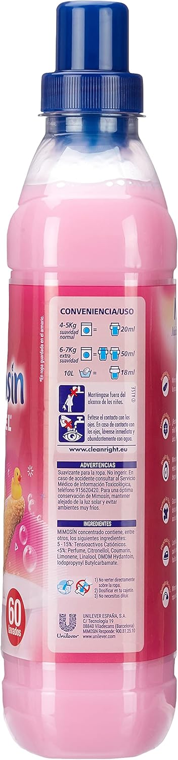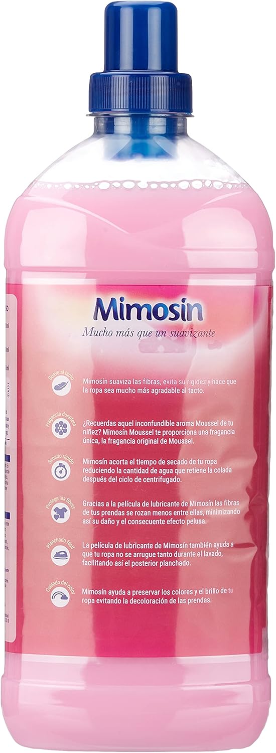About this item Mimosín Fabric Softener Concentrate Moussel 60 Washes Moussel concentrated fabric softener is a product that softens the fibres of the fabrics, leaving them pleasant to the touch Moussel has a unique Moussel fragrance that will remind you of times of your childhood, up to 250 days of freshness* * * in clothes stored in the closet The product helps maintain the color and shine of your clothes and promotes quick drying Thanks to a special formula, Mimosín helps prevent the appearance of lint in your clothes Mimosin lubricant film acts so that your clothes do not wrinkle as much, reducing the ironing time › See more product details,Mimosín Fabric Softener Concentrate Moussel 60 Washes,Moussel concentrated fabric softener is a product that softens the fibres of the fabrics, leaving them pleasant to the touch,Moussel has a unique Moussel fragrance that will remind you of times of your childhood, up to 250 days of freshness* * * in clothes stored in the closet,The product helps maintain the color and shine of your clothes and promotes quick drying,Thanks to a special formula, Mimosín helps prevent the appearance of lint in your clothes,Mimosin lubricant film acts so that your clothes do not wrinkle as much, reducing the ironing time
