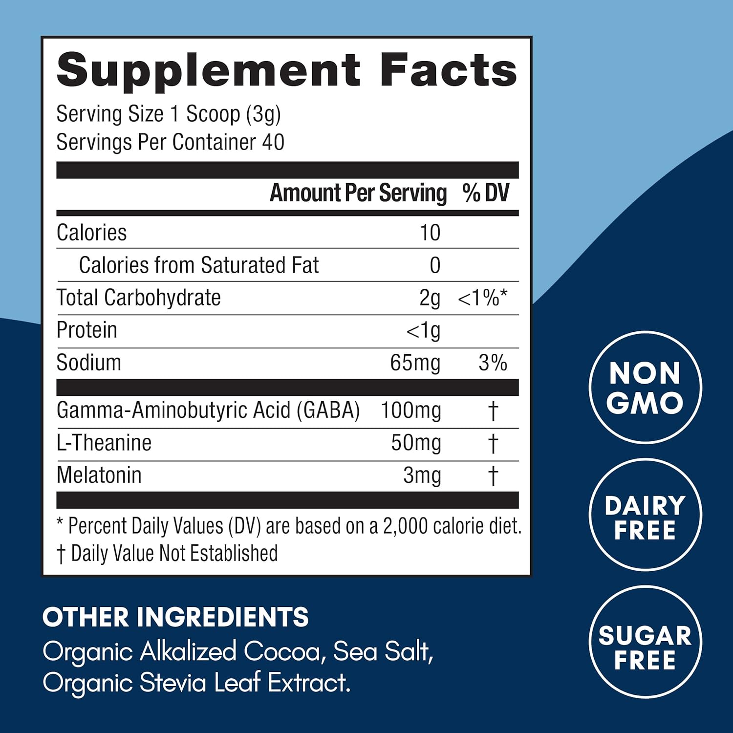 About this item Fast Acting: Once mixed with liquid, our sleepy time cocoa powder unsweetened is absorbed faster than pills, patches, or gummies that need to be broken down by the body. It also won't leave you feeling groggy the next day. Our Dutch cocoa powder delivers a smooth and rich chocolatey experience in mere seconds. Simple and Good: Only 6 ingredients in our cocoa powder and mixes well with water or any milk, just 10 calories per serving, and fat free, gluten free, vegan, non GMO, sugar free, dairy free, paleo, and keto friendly. Travel Essential: A flight must-have, for no jet lag, our hot chocolate mix is made from organic cocoa powder organic stevia, sea salt, and our mindful sleep blend in a compact resealable bag with a scoop. Each sip of our cocoa powder will envelop your senses with its heavenly and delightful sweetness. Sweet Dream Sleep Powder: Beam yourself to deep sleep with the blend of pure melatonin, GABA, and L-Theanine. Our high flavonoid coco combines to make a delicious warm chocolate drink mix before bedtime. Our high flavanol cocoa powder will delight your taste buds. Rest Easily: A potent combination of adaptogens, adrenal support, cortisol manager, and stress relief supplements, this non habit forming homeopathic sleep supplement provides a restful night's sleep. These Cocoa flavanols promote relaxation, enhance sleep quality, and wake up refreshed. › See more product details,Fast Acting: Once mixed with liquid, our sleepy time cocoa powder unsweetened is absorbed faster than pills, patches, or gummies that need to be broken down by the body. It also won't leave you feeling groggy the next day. Our Dutch cocoa powder delivers a smooth and rich chocolatey experience in mere seconds,Simple and Good: Only 6 ingredients in our cocoa powder and mixes well with water or any milk, just 10 calories per serving, and fat free, gluten free, vegan, non GMO, sugar free, dairy free, paleo, and keto friendly,Travel Essential: A flight must-have, for no jet lag, our hot chocolate mix is made from organic cocoa powder organic stevia, sea salt, and our mindful sleep blend in a compact resealable bag with a scoop. Each sip of our cocoa powder will envelop your senses with its heavenly and delightful sweetness,Sweet Dream Sleep Powder: Beam yourself to deep sleep with the blend of pure melatonin, GABA, and L-Theanine. Our high flavonoid coco combines to make a delicious warm chocolate drink mix before bedtime. Our high flavanol cocoa powder will delight your taste buds,Rest Easily: A potent combination of adaptogens, adrenal support, cortisol manager, and stress relief supplements, this non habit forming homeopathic sleep supplement provides a restful night's sleep. These Cocoa flavanols promote relaxation, enhance sleep quality, and wake up refreshed