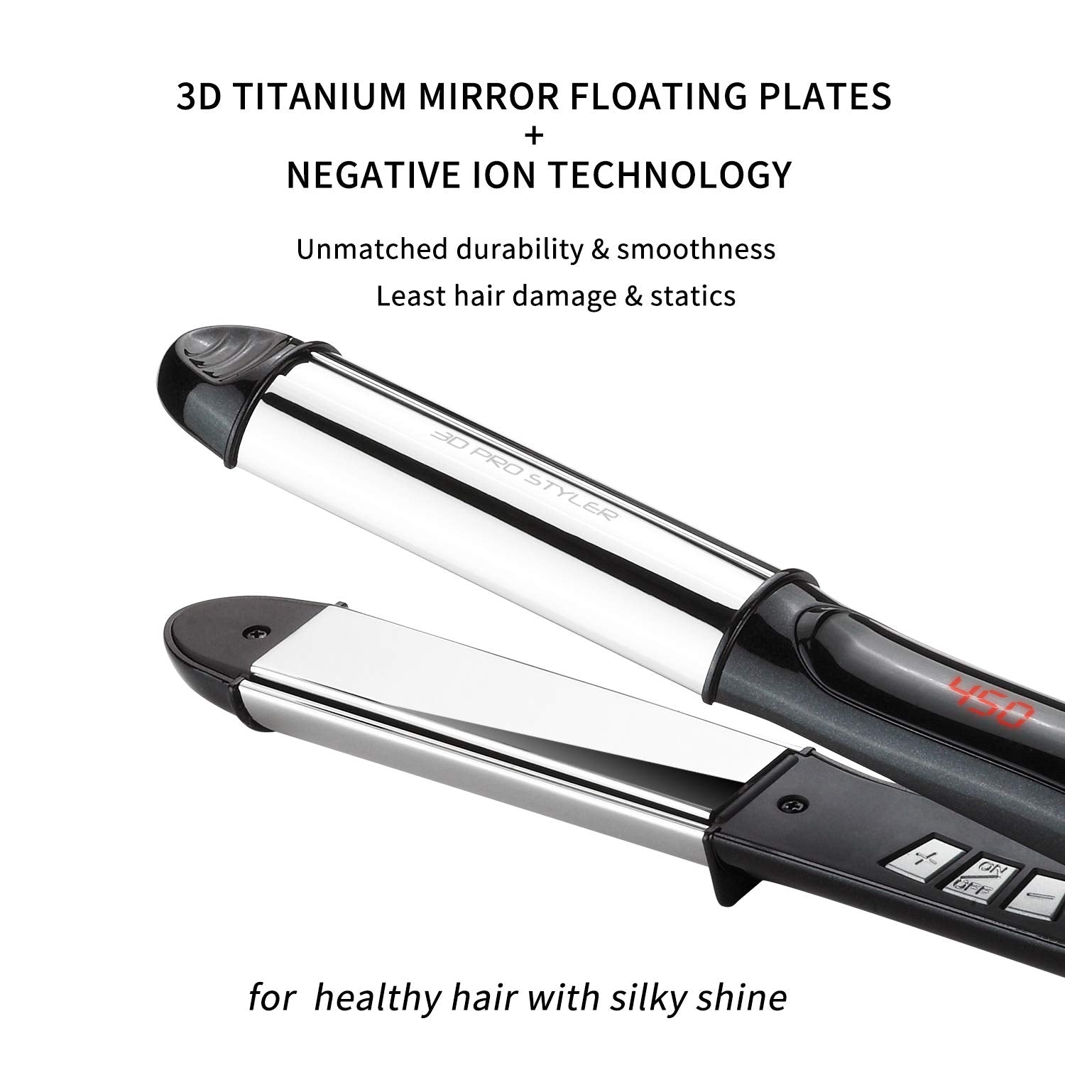 ABOUT THE PRODUCT: 1 > MULTI-FUNCTIONAL HAIR STYLING IRON This titanium straightening iron creates ultra smooth straight, wavy and bouncy hair styles easily with long-lasting results. Fit for thin, thick, fine, coarse hair long or short 2 > 3D TITANIUM MIRROR FLOATING PLATES Ultra smooth and highly durable for full contact with hair. Innovative semicircular edges. Least hair damage. Least statics. Smooth glides and even heat distribution for perfect hair styles with silky shine in just minutes 3 > ADJUSTABLE LED TEMP SETTINGS & HIDDEN POWER BUTTONS Precision temp control from 250°F to 450 °F with 20 °F increments change for each press for professional styling with minimal hair damage. Hidden power buttons to avoid accidental touch-offsMIRACOMB 3D PRO Nano Titanium Flat Iron, 2 in 1 Hair Straightener Curler with 1 Inch Floating Plates, 11 Temp Adjustments, Max 450 ° F, Auto Shut off, 18 Month Warranty (Package May Vary)
