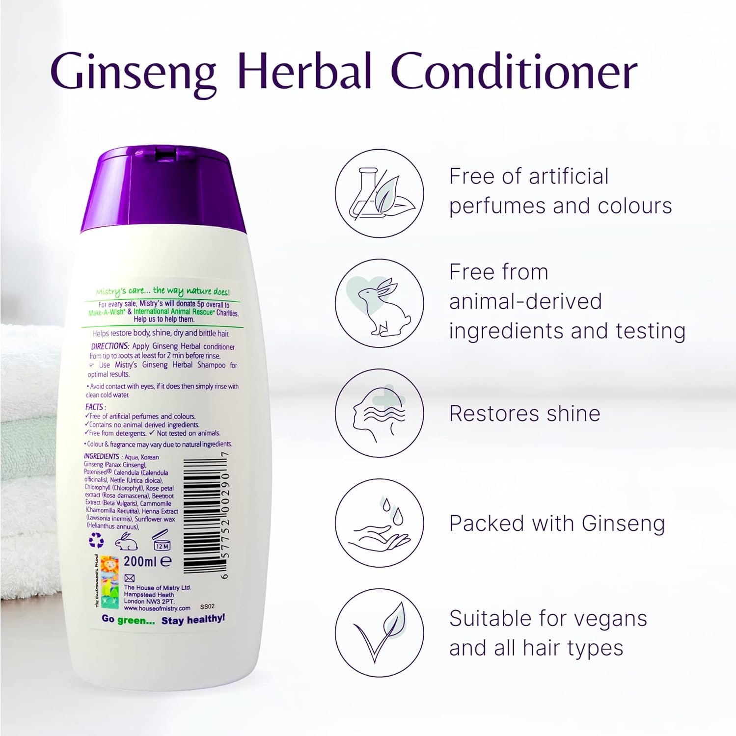 About this item GENTLE HERBAL CONDITIONER - Perfect extract moisturiser for your hair. Packed with ginseng and calendula , this conditioner helps to restore shine to dry and brittle hair, making it the ideal choice for everyday use. Unlock the mystery of hair VEGAN FORMULATED CARE - Infused with the Potenised ginseng ingredient to deliver ultimate benefits without artificial perfumes or colours. Ginseng herbal conditioner is a deep cleansing and conditioning agent for the hair and scalp PURE CLEANSING POWER - A gentle conditioner with rich proteins and nutrients. Keeping your hair healthier and stronger. Not tested on animals, providing you with a clear conscience and a cleaner, healthier body, guilt-free PROTECTION FOR EVERYONE - This hair conditioner is perfect for all hair types, making it an essential household product for children and adults alike. Its mild formula helps rejuvenate hair HOUSE OF MISTRY - Dr Mistry is a true visionary in holistic wellness, with a focus on quality, purity, and sustainability. A unique approach to the best natural science and ancient healing traditions. A trusted brand for those serious about their wellbeing › See more product details,GENTLE HERBAL CONDITIONER - Perfect extract moisturiser for your hair. Packed with ginseng and calendula , this conditioner helps to restore shine to dry and brittle hair, making it the ideal choice for everyday use. Unlock the mystery of hair,VEGAN FORMULATED CARE - Infused with the Potenised ginseng ingredient to deliver ultimate benefits without artificial perfumes or colours. Ginseng herbal conditioner is a deep cleansing and conditioning agent for the hair and scalp,PURE CLEANSING POWER - A gentle conditioner with rich proteins and nutrients. Keeping your hair healthier and stronger. Not tested on animals, providing you with a clear conscience and a cleaner, healthier body, guilt-free,PROTECTION FOR EVERYONE - This hair conditioner is perfect for all hair types, making it an essential household product for children and adults alike. Its mild formula helps rejuvenate hair,HOUSE OF MISTRY - Dr Mistry is a true visionary in holistic wellness, with a focus on quality, purity, and sustainability. A unique approach to the best natural science and ancient healing traditions. A trusted brand for those serious about their wellbeing