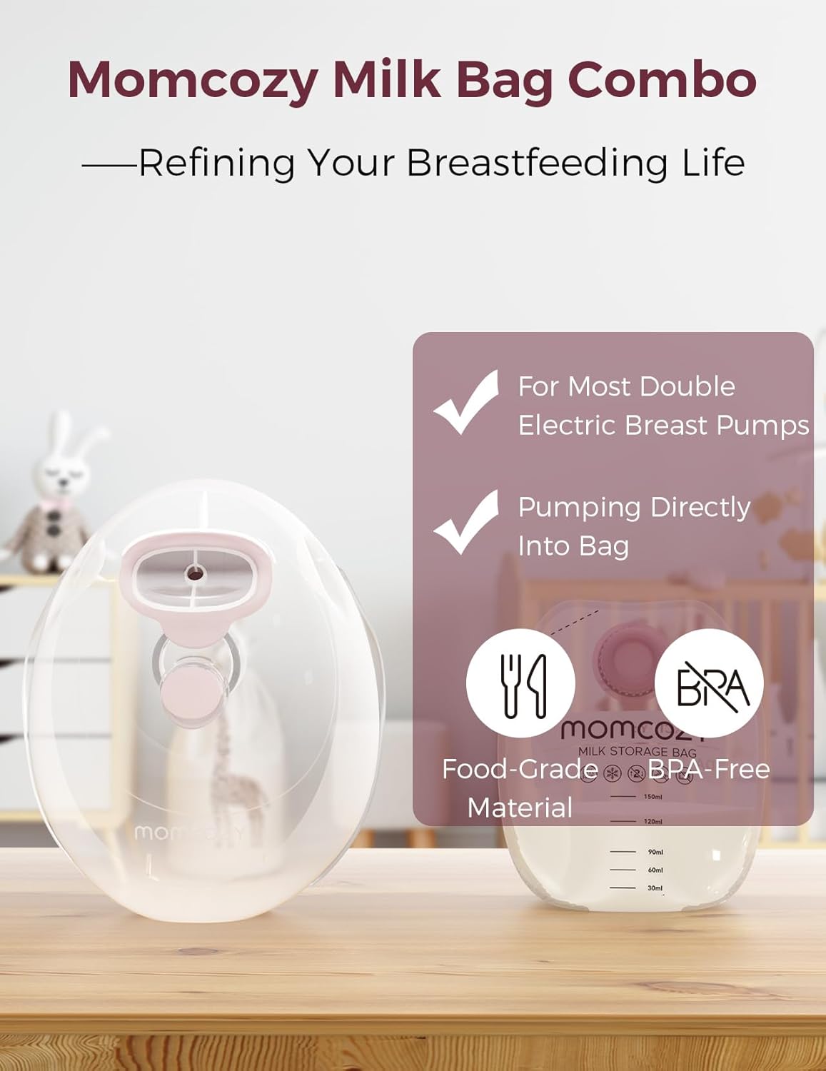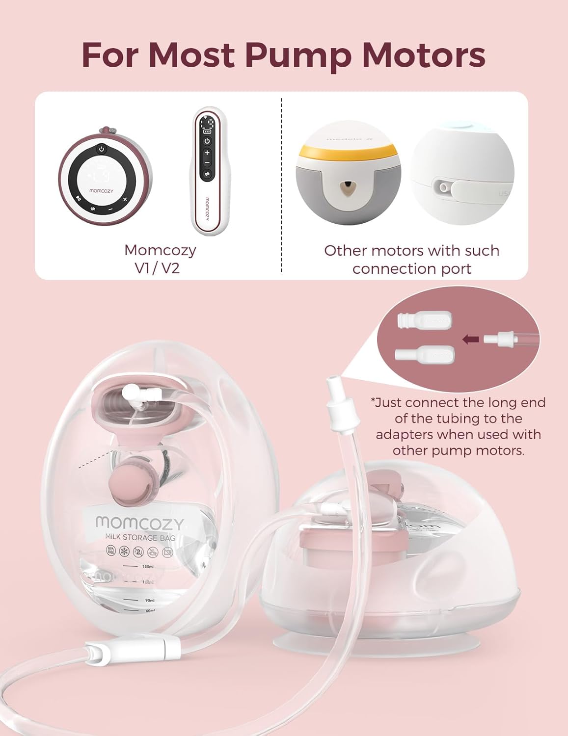 Versatile Compatibility—Equipped With Adapters And Various Sizes Of Flange Inserts (17/19/21Mm), This Milk Collector Seamlessly Integrates With Not Only The Momcozy V Series Breast Pumps But Also The Majority Of Double Tubing Breast Pumps, Ensuring Convenience And Compatibility10Direct-To-Bag Collection—Featuring A 5Oz/150Ml Milk Bag Capacity, Our Integrated Milk Collection Cup & Bag Combo Enables Milk To Flow Directly Into The Bag, Minimizing Transfer And Ensuring A Convenient, Hygienic, And Efficient Pumping Experience10Convenient Milk Storage—With Disposable Screw-On Milk Bags Designed To Prevent Leaks, Your Milk Stays Fresh And Secure, Providing A Hassle-Free Solution For Busy Moms10Enhanced Comfort—Achieve Optimal Pumping Comfort With Momcozy'S Doublefit Flange, Providing A Snug Fit, Ensuring Efficient Milk Extraction, And Allowing You To Pump With Ease10Simplified Cleaning—Features Only Three Parts That Come Into Contact With Milk, Streamlining The Cleaning Process, And Offering Convenience Without Compromising Hygiene For Your Baby'S Milk10