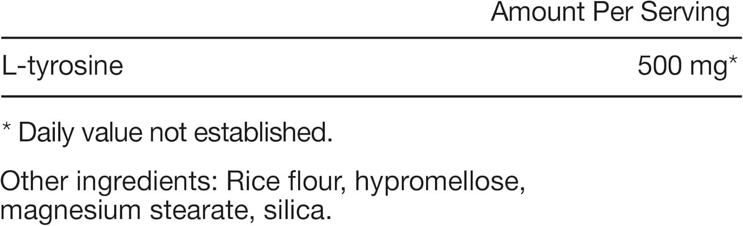 About this item Enhances Cognitive Performance - Tyrosine is a crucial amino acid that supports the production of key neurotransmitters like dopamine & norepinephrine, which are essential for maintaining focus, attention, & overall brain function. Supports Stress Management - By aiding in the synthesis of important neurotransmitters, tyrosine helps your body effectively manage stress, promoting resilience & mental clarity under pressure. Optimizes Motivation & Mood - L-tyrosine plays a vital role in the dopamine pathway, which is involved in motivation & reward. This can help improve drive, mood, & overall cognitive performance. Pure & Potent Formulation - Tyrosine is obtained through natural fermentation processes or extracted from plant-based sources, ensuring high purity & potency. Take one capsule daily whenever you need a cognitive boost, but avoid taking it within one to two hours of sleep. Crafted by Experts - We work with some of the greatest minds in science & athletic performance who tap into the latest research & real-world experience to design products with one common goal - to help you be your best. › See more product details,Enhances Cognitive Performance - Tyrosine is a crucial amino acid that supports the production of key neurotransmitters like dopamine & norepinephrine, which are essential for maintaining focus, attention, & overall brain function,Supports Stress Management - By aiding in the synthesis of important neurotransmitters, tyrosine helps your body effectively manage stress, promoting resilience & mental clarity under pressure,Optimizes Motivation & Mood - L-tyrosine plays a vital role in the dopamine pathway, which is involved in motivation & reward. This can help improve drive, mood, & overall cognitive performance,Pure & Potent Formulation - Tyrosine is obtained through natural fermentation processes or extracted from plant-based sources, ensuring high purity & potency. Take one capsule daily whenever you need a cognitive boost, but avoid taking it within one to two hours of sleep,Crafted by Experts - We work with some of the greatest minds in science & athletic performance who tap into the latest research & real-world experience to design products with one common goal - to help you be your best