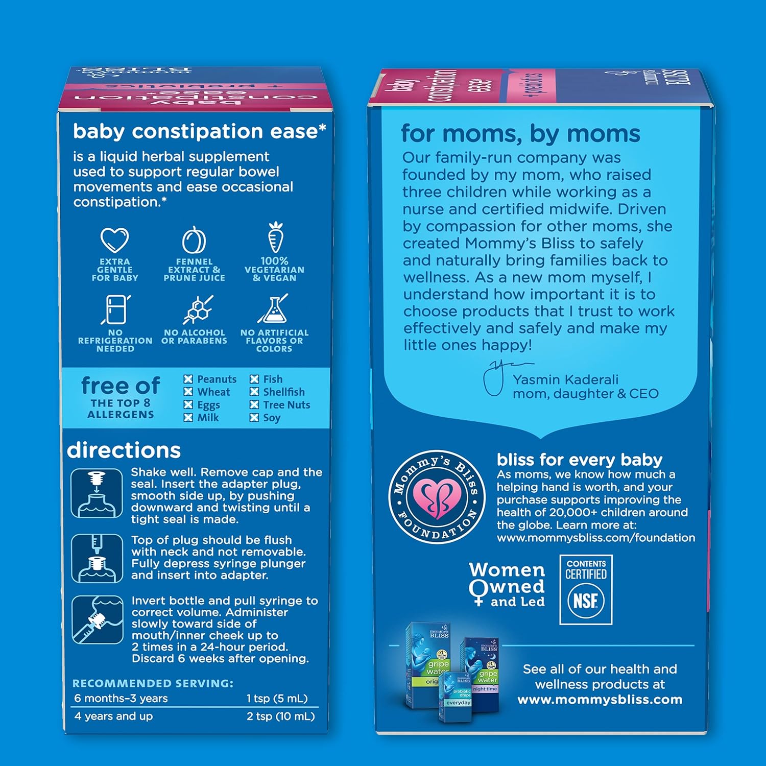 Gentle Ingredients: Naturally and gently relieve occasional baby and toddler constipation without any harsh chemical laxatives; Made with prune juice, organic dandelion, and organic fennel; to help with constipation, regularity, and digestive health10Support Regular Bowel Movements and Digestion: Help your little one's delicate tummy with healthy digestion; Our Baby Constipation Ease helps with relieving occasional constipation and promoting regular bowel movements10Easy to Adminster: Comes with a no-spill syringe making it easy to adminster to babies and children age 6 months and up10Non-GMO, Free of Top 8 Allergens, No artificial color and flavors: We believe simpler is better; That means in everything we make, we include only what you or your child needs and never anything they don't10Mom Designed Peace of Mind: Mommy's Bliss was founded by Roshan Kaderali, a mom and pediatric nurse, midwife and doula, on a mission to help moms everywhere bond with their babies by creating trusted products that incorporate wise ingredients1010