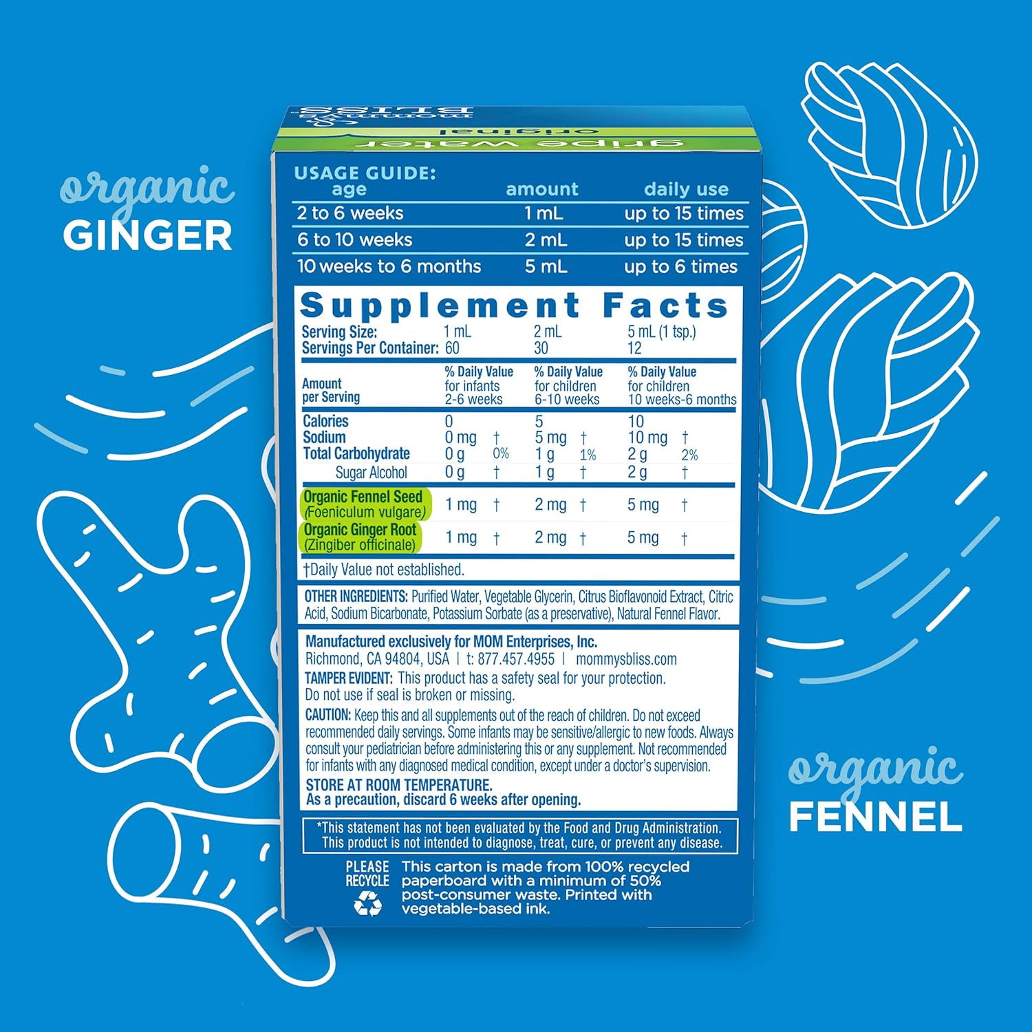 Mommy's Bliss Orignal Gripe Water & Gas Relief Drops Combo Pack combines the best-selling gripe water in the U.S. with our fast-acting gas drops to ensure your baby's suffering from stomach discomfort, gas, and general fussiness can be relieved quickly and safely10Baby Gas Drops with ginger extract flavor - a taste that your baby will love, and simethicone, a pediatrician recommended solution for relieving gas quickly in newborns and older10Orginal Gripe Water designed for babies 2 weeks and older is gentle, safe, and effective with organic ginger and fennel extracts that ease your baby's stomach discomfort associated with gas, colic, hiccups, teething, & general fussiness10Our Combo Pack contains (1) gripe water & (1) gas relief drops in convenient travel-sized bottles including syringes; keep in every diaper bag and anywhere handy when your baby needs gas relief or is generally fussy10Safe for babies with gentle and healthful ingredients - 100% vegan & vegetarian, no artificial colors or flavors; gluten-, dairy-, and soy-free; alcohol and paraben free. No refrigeration required after opening; 100% recyclable packaging; BPA free