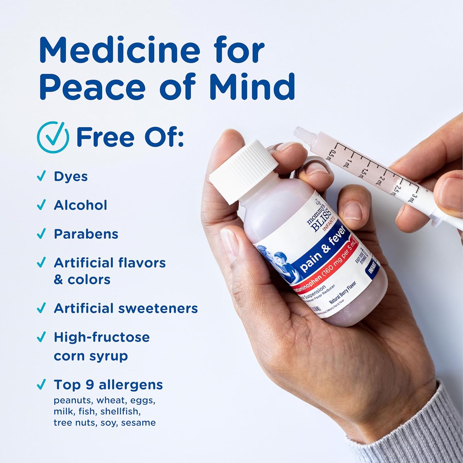 About this item Pain & Fever Reducer for Infants: Mommy's Bliss Infant Acetaminophen is an effective solution for temporarily reducing fever and relieving minor aches and pains associated with the common cold, flu, headache, sore throat or toothaches. For babies 0-3 years. Clean Label Project Verified: The first-ever acetaminophen to be Clean Label Project certified. We call that Medicine for Peace of Mind Yummy Natural Berry Flavor: Our infant acetaminophen has a delicious natural berry flavor with organic elderberry juice that babies will love Easy to Take: Comes with an easy-to-use syringe, making it easy to give your baby the recommended dosage Medicine for Peace of Mind: Free of dyes, alcohol, parabens, artificial flavors & colors, artificial sweeteners, high-fructose corn syrup, and the top 9 allergens › See more product details,Pain & Fever Reducer for Infants: Mommy's Bliss Infant Acetaminophen is an effective solution for temporarily reducing fever and relieving minor aches and pains associated with the common cold, flu, headache, sore throat or toothaches. For babies 0-3 years,Clean Label Project Verified: The first-ever acetaminophen to be Clean Label Project certified. We call that Medicine for Peace of Mind,Yummy Natural Berry Flavor: Our infant acetaminophen has a delicious natural berry flavor with organic elderberry juice that babies will love,Easy to Take: Comes with an easy-to-use syringe, making it easy to give your baby the recommended dosage,Medicine for Peace of Mind: Free of dyes, alcohol, parabens, artificial flavors & colors, artificial sweeteners, high-fructose corn syrup, and the top 9 allergens