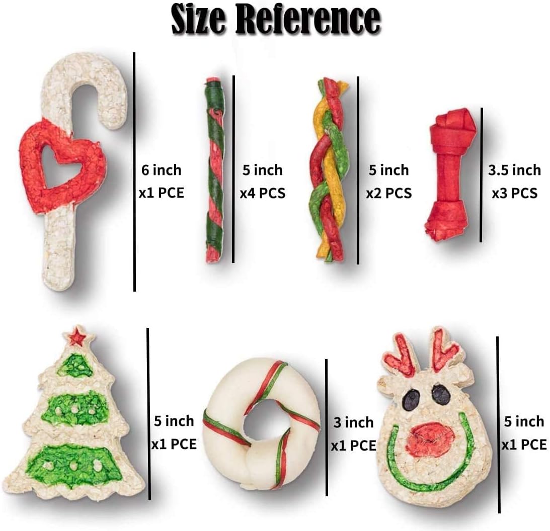 Christmas Dog Rawhide Sticks X 4Pcs. Small Rawhide Bones X 3Pcs.Munchy Twist Stick X 2Pc. Doughnut Roll X 1Pc.Munchy Heart Candy Cane X 1Pc.Munchy Tree X 1Pc.Munchy Reindeer X 1Pc