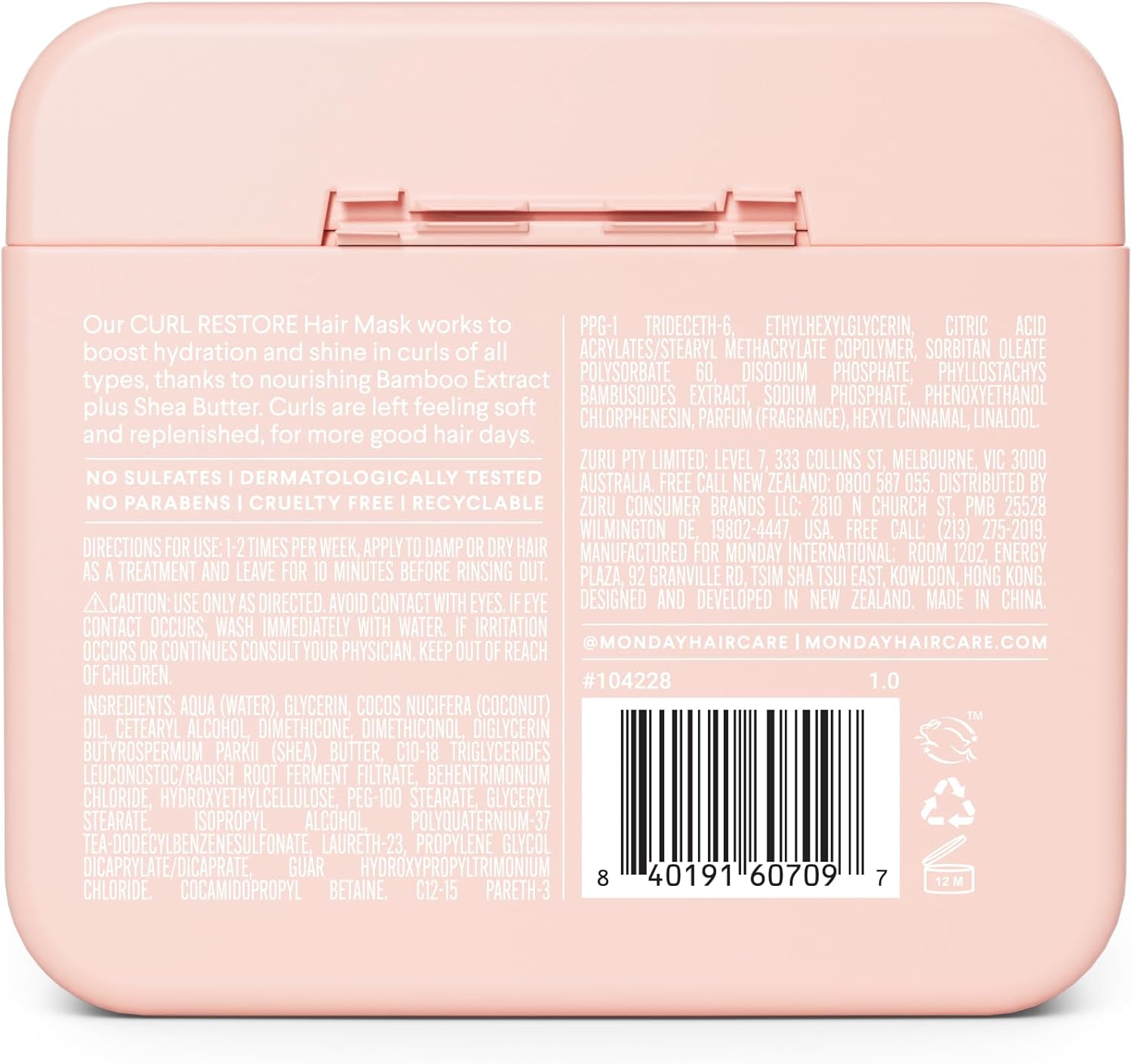 Product description MONDAY Haircare DEEP MOISTURE Hair Mask works to restore strength and nourishment to dry and damaged hair with hydrating naturals plus reparative Keratin. MONDAY’s award-winning, clean formulas are dermatologically tested, pH balanced, contain ethically sourced natural extracts and are not tested on animals. Ingredients AQUA (WATER), GLYCERIN, CETEARYL ALCOHOL, DIMETHICONE, COCOS NUCIFERA (COCONUT) OIL, STEARYL ALCOHOL, DIPROPYLENE GLYCOL, DIMETHICONOL, BUTYROSPERMUM PARKII (SHEA) BUTTER, THEOBROMA CACAO (COCOA) SEED BUTTER, ARGANIA SPINOSA KERNEL OIL, HYDROLYZED KERATIN, BEHENTRIMONIUM CHLORIDE, PHENOXYETHANOL, HYDROXYETHYLCELLULOSE, PEG-100 STEARATE, GLYCERYL STEARATE, ISOPROPYL ALCOHOL, POLYSORBATE 80, CHLORPHENESIN, C12-15 PARETH-3, DISODIUM EDTA, TEA-DODECYLBENZENESULFONATE, COCAMIDOPROPYL BETAINE, GUAR HYDROXYPROPYLTRIMONIUM CHLORIDE, CITRIC ACID, DISODIUM PHOSPHATE, POLYSORBATE 60, SODIUM PHOSPHATE, PARFUM (FRAGRANCE), HEXYL CINNAMAL, LINALOOL. P.when('A').execute(function(A) { A.on('a:expander:toggle_description:toggle:collapse', function(data) { window.scroll(0, data.expander.$expander[0].offsetTop-100); }); }); Directions After shampooing, apply 300ml of the product to damp hair, massage it in, leave for a few minutes, then rinse out. Use once a week. If you have sensitive skin or prefer unscented products, be aware of the coconut scent. Safety Warning CAUTION: USE ONLY AS DIRECTED. AVOID CONTACT WITH EYES. IF EYE CONTACT OCCURS, WASH IMMEDIATELY WITH WATER. IF IRRITATION OCCURS OR CONTINUES, CONSULT YOUR PHYSICIAN. STORE IN A COOL, DRY PLACE OUT OF DIRECT SUNLIGHT. KEEP OUT OF REACH OF CHILDREN. See more,Deeply hydrating weekly hair treatment,For dry to damaged hair,Contains nourishing Keratin,No sulfates or parabens,Dermatologically tested