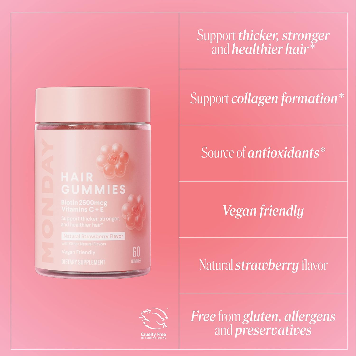 WHAT THEY DO: Our naturally strawberry-flavored Hair Gummies are packed with 2500mcg of Biotin per serving, plus antioxidant Vitamins C and E. This delicious chewable daily supplement supports thicker, stronger and healthier hair for more good hair days10WHAT’S INSIDE: 2500mcg Biotin per serving helps to maintain hair health, while antioxidant Vitamin C supports collagen formation and Vitamin E helps protect cells from oxidative stress and free radical damage.* Pack contains 60 gummies, which is a month’s supply. Take 2 gummies daily, preferably with food10REAL RESULTS: In a consumer perception study with 62 people who consumed the recommended daily serving for one month, 95% said hair was healthier, 92% said hair was more smooth, and 91% said hair was shinier and more hydrated10VEGAN AND CRUELTY-FREE: These chewable gummies are vegan, making them suitable for vegans and vegetarians. All MONDAY Haircare products are approved as cruelty-free under the Leaping Bunny programme by Cruelty Free International10FREE FROM: Our Hair Gummies are free from gluten, preservatives, paraffin wax, and animal-derived ingredients. Bottles are also fully recyclable1010