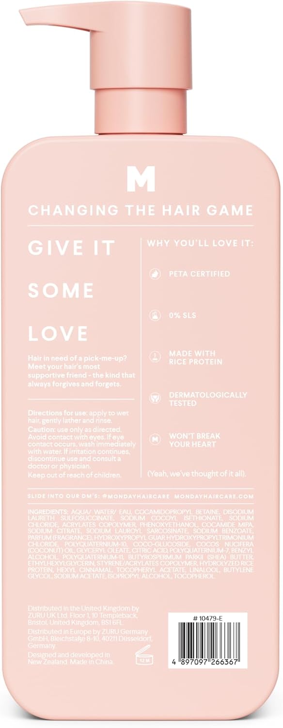 About this item MOISTURE CONDITIONER: This best-selling formula helps to hydrate and add moisture to dry, coarse and stressed hair and coily and curly hair types. It contains Coconut Oil, Rice Protein, Shea Butter and Provitamin B5 to leave hair feeling nourished and strong. SALON-QUALITY: Our modern formulas are dermatologically tested, PH-balanced, and free from SLS, parabens and phthalates. We instead use natural ingredients such as shea butter, coconut oil, rice protein and vitamin E to nourish and restore. AWARD-WINNING: Our range of Shampoo and Conditioner has 11 major beauty awards and counting, including a Cosmopolitan 2021 Holy Grail Beauty Award, Glamour 2021 Beauty Award, Cosmopolitan 2021 Beauty Award, and an InStyle 2022 Best Beauty Buy Award. CERTIFIED CRUELTY-FREE: All of MONDAY’s products are approved as cruelty-free under the Leaping Bunny programme by Cruelty Free International. We’re also proud to be recognised by PETA as a brand that does not test on animals. 100% RECYCLABLE BOTTLES: Not only do our little pink bottles look great in your shower, they’re made from 100% recyclable plastic to help minimise carbon footprint and reduce landfill. A win for your hair and for the environment. › See more product details,MOISTURE CONDITIONER: This best-selling formula helps to hydrate and add moisture to dry, coarse and stressed hair and coily and curly hair types. It contains Coconut Oil, Rice Protein, Shea Butter and Provitamin B5 to leave hair feeling nourished and strong,SALON-QUALITY: Our modern formulas are dermatologically tested, PH-balanced, and free from SLS, parabens and phthalates. We instead use natural ingredients such as shea butter, coconut oil, rice protein and vitamin E to nourish and restore,AWARD-WINNING: Our range of Shampoo and Conditioner has 11 major beauty awards and counting, including a Cosmopolitan 2021 Holy Grail Beauty Award, Glamour 2021 Beauty Award, Cosmopolitan 2021 Beauty Award, and an InStyle 2022 Best Beauty Buy Award,CERTIFIED CRUELTY-FREE: All of MONDAY’s products are approved as cruelty-free under the Leaping Bunny programme by Cruelty Free International. We’re also proud to be recognised by PETA as a brand that does not test on animals,100% RECYCLABLE BOTTLES: Not only do our little pink bottles look great in your shower, they’re made from 100% recyclable plastic to help minimise carbon footprint and reduce landfill. A win for your hair and for the environment