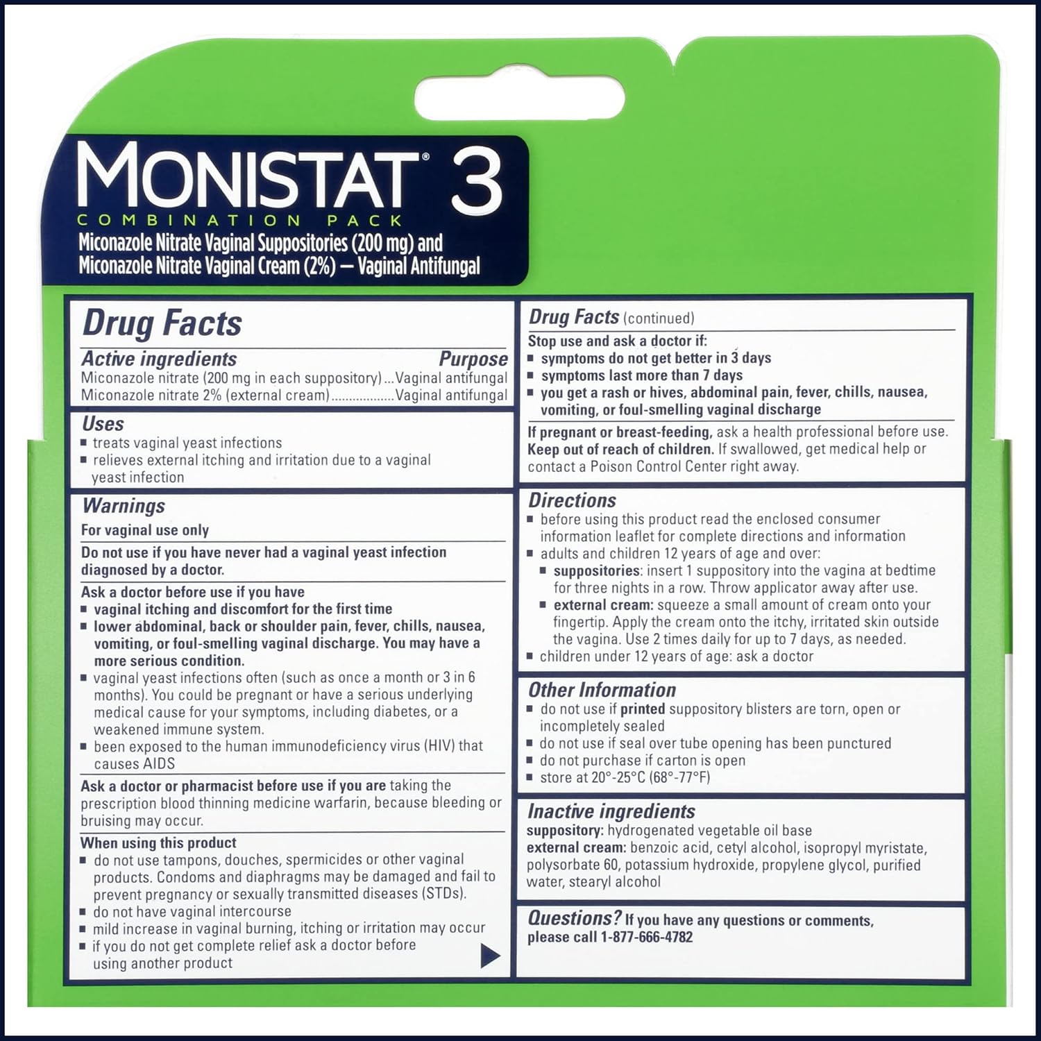 About this item Monistat 3-Day is an effective yeast infection treatment for women, helping to reduce symptoms associated with yeast infections such as external irritation, itching, and discomfort Monistat Instant Itch Relief Cream is an effective anti-itch cream for women, cooling and soothing irritated skin to provide long-lasting relief Monistat vaginal suppositories combination pack relieves yeast infection symptoms 4x faster than the leading prescription pill*; pack includes external Monistat anti-itch cream Monistat Suppository Treatment contains 3 ready-to-use suppositories in a disposable, applicator; each Monistat suppository contains 200 mg miconazole nitrate, a clinically proven safe and effective yeast infection treatment Monistat is the number 1 gynecologist-recommended brand over the counter product in the vaginal anti-fungal category in the US among OB/GYNs** *Based on clinical study of Monistat 1-Dose Ovule Combination Pack versus fluconazole 150 mg tablet; **According to the ProVoice Survey, fielded to US/OB-GYNs from 12/1/21-11/30/22 โบ See more product details,Monistat 3-Day is an effective yeast infection treatment for women, helping to reduce symptoms associated with yeast infections such as external irritation, itching, and discomfort,Monistat Instant Itch Relief Cream is an effective anti-itch cream for women, cooling and soothing irritated skin to provide long-lasting relief,Monistat vaginal suppositories combination pack relieves yeast infection symptoms 4x faster than the leading prescription pill*; pack includes external Monistat anti-itch cream,Monistat Suppository Treatment contains 3 ready-to-use suppositories in a disposable, applicator; each Monistat suppository contains 200 mg miconazole nitrate, a clinically proven safe and effective yeast infection treatment,Monistat is the number 1 gynecologist-recommended brand over the counter product in the vaginal anti-fungal category in the US among OB/GYNs,*Based on clinical study of Monistat 1-Dose Ovule Combination Pack versus fluconazole 150 mg tablet; **According to the ProVoice Survey, fielded to US/OB-GYNs from 12/1/21-11/30/22