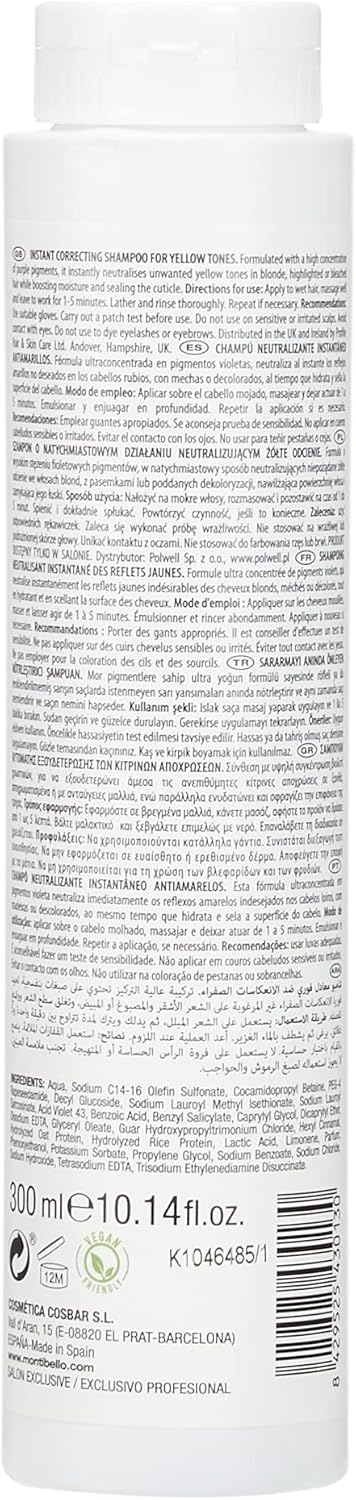 Product Description Montibello colour correction stop yellow shampoo 300 ml (neutralizer+pigment lilac) Ingredients Consult Packaging P.when('A').execute(function(A) { A.on('a:expander:toggle_description:toggle:collapse', function(data) { window.scroll(0, data.expander.$expander[0].offsetTop-100); }); }); Directions 1. Wet hair thoroughly. 2. Apply shampoo to hair, creating a lather. 3. Rinse shampoo out of hair completely. 4. Repeat if necessary. See more,Activated carbon shampoo without sulphates