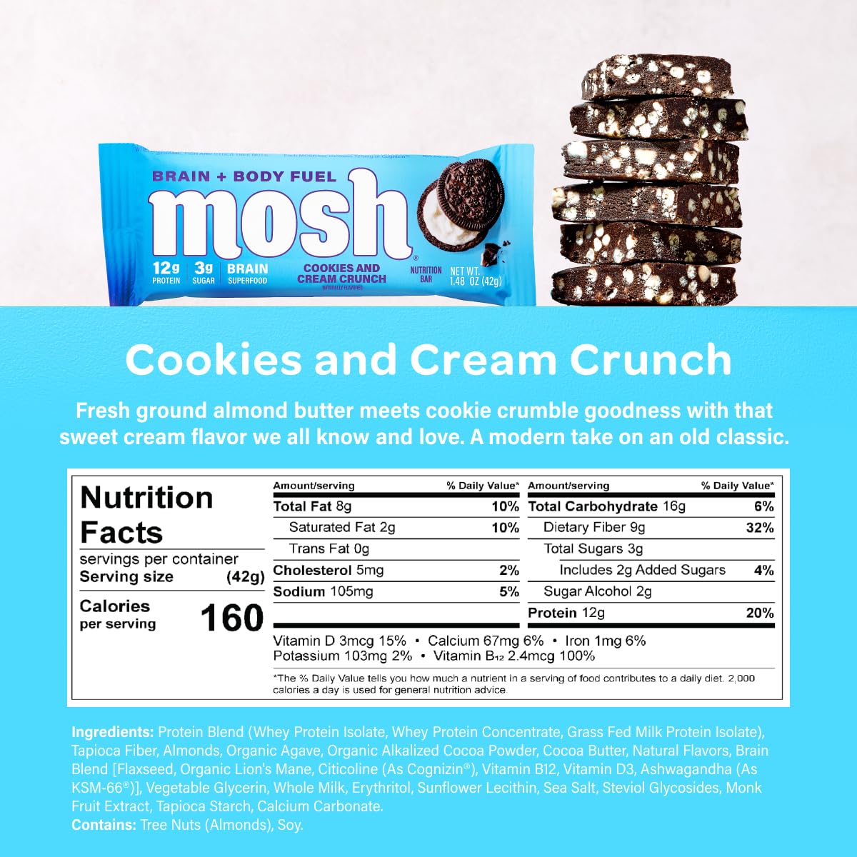 Mosh Cookies And Cream Crunch Bars, 12G Grass-Fed Protein, Keto Snack, Gluten-Free, No Added Sugar, Lion'S Mane, B12 Vitamins, Supports Brain Health, Workout Recovery, Breakfast To-Go (12 Bars)…