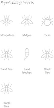 Repels mosquitoes, midges, ticks, sand flies, land leeches, black flies, stable flies
