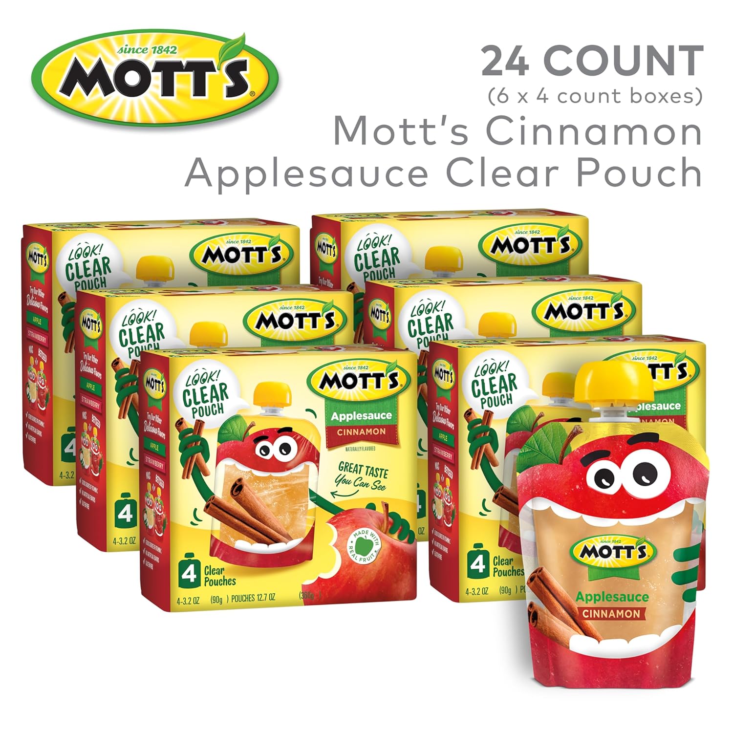 Mott'S Cinnamon Applesauce, 3.2 Oz Clear Pouches, 24 Count (6 Packs Of 4), No Artificial Flavors, Good Source Of Vitamin C, Nutritious Option For The Whole Family