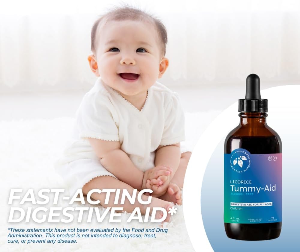 About this item Natural Gas Relief for Infants & Kids: Licorice Tummy-Aid is formulated to relieve infant gas, colic, reflux, and upset stomach using gentle, time-tested ingredients. Helps promote healthy digestion, reduce tummy discomfort, and support more restful sleep for babies, toddlers, and young children. Gentle, Herbal Formula with Naturally Licorice-Flavored Taste: Made with a soothing herbal blend traditionally used to ease baby gas, colic, bloating, and digestive discomfort—free from sugar, artificial flavors, alcohol, and preservatives. Naturally licorice flavored from fennel seed extract, this infant gas relief supplement offers a mild, pleasant taste that’s easy for babies and toddlers to take. Alcohol-Free & Easy to Use Liquid Drops: This safe, sugar-free digestive supplement for infants and toddlers features a mild, baby-friendly taste and mess-free dropper application. Made with vegetable glycerine and distilled water, it's an alcohol-free gas relief remedy that can be added to formula, juice, or given directly for fast, gentle tummy support. Available in Two Convenient Sizes: Choose between a 2 oz travel-friendly bottle or a 4 oz value size, both designed for easy, mess-free dosing at home or on the go. Mountain Meadow Herbs supplements are manufactured in a GMP-Certified facility in the USA, nestled in the beautiful Northwest Montana region › See more product details,Natural Gas Relief for Infants & Kids: Licorice Tummy-Aid is formulated to relieve infant gas, colic, reflux, and upset stomach using gentle, time-tested ingredients. Helps promote healthy digestion, reduce tummy discomfort, and support more restful sleep for babies, toddlers, and young children,Gentle, Herbal Formula with Naturally Licorice-Flavored Taste: Made with a soothing herbal blend traditionally used to ease baby gas, colic, bloating, and digestive discomfort—free from sugar, artificial flavors, alcohol, and preservatives. Naturally licorice flavored from fennel seed extract, this infant gas relief supplement offers a mild, pleasant taste that’s easy for babies and toddlers to take,Alcohol-Free & Easy to Use Liquid Drops: This safe, sugar-free digestive supplement for infants and toddlers features a mild, baby-friendly taste and mess-free dropper application. Made with vegetable glycerine and distilled water, it's an alcohol-free gas relief remedy that can be added to formula, juice, or given directly for fast, gentle tummy support,Available in Two Convenient Sizes: Choose between a 2 oz travel-friendly bottle or a 4 oz value size, both designed for easy, mess-free dosing at home or on the go,Mountain Meadow Herbs supplements are manufactured in a GMP-Certified facility in the USA, nestled in the beautiful Northwest Montana region