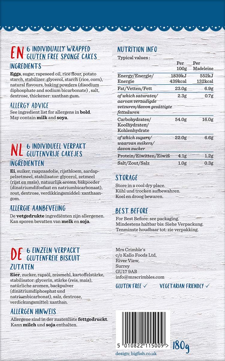 Mrs Crimble'S Authentically French Classic Madeleines, 180 G (Pack Of 6)