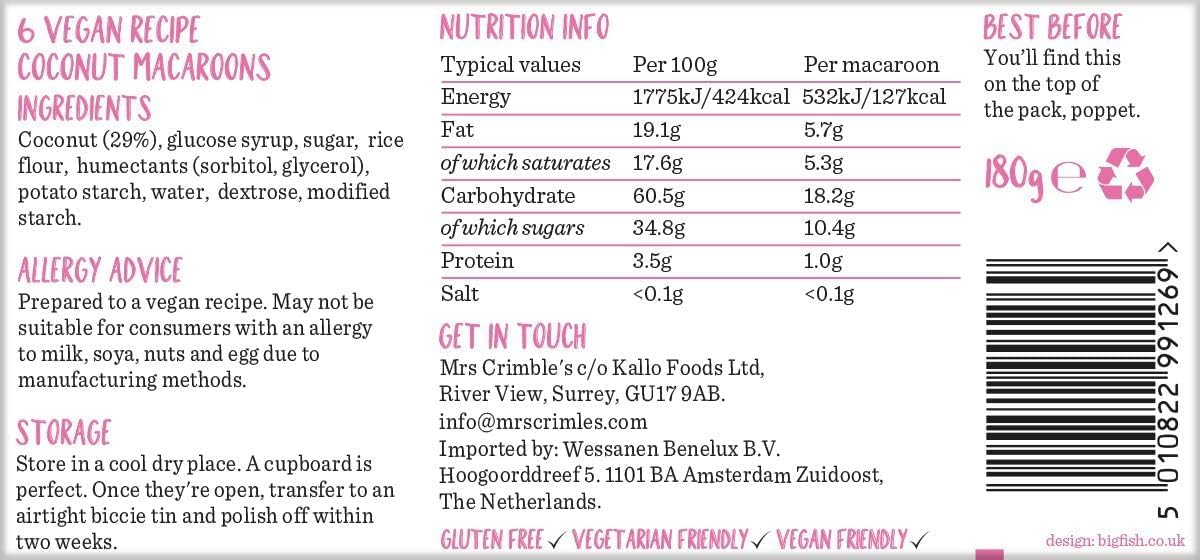 Mrs Crimble'S Gluten Free Vegan Coconut Macaroons, Premium Quality, Certified Free From Gluten, Wheat Free & Vegetarian Friendly, Pack Of 6 180G