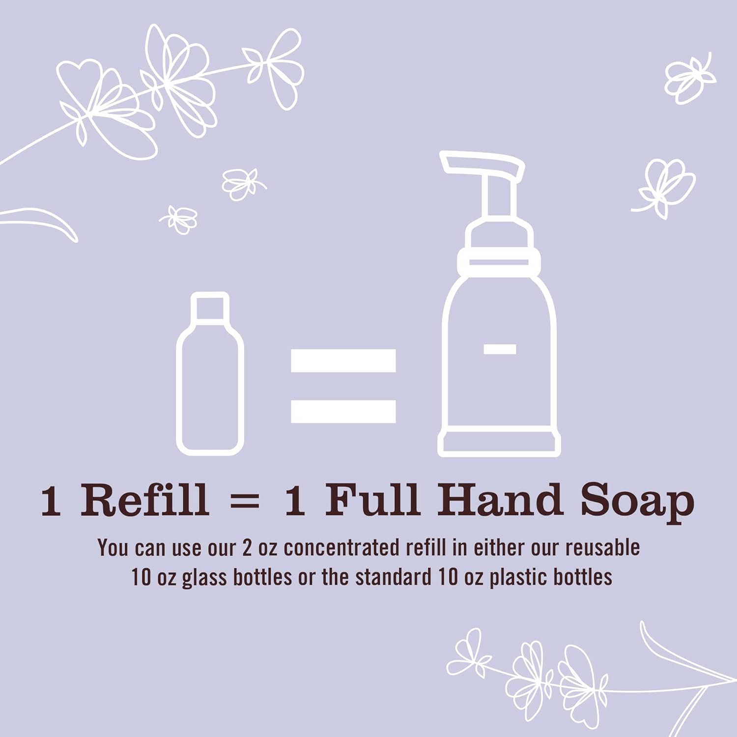 Mrs. Meyer's Clean Day 2 oz Concentrated Refill is equal to 1 full Foaming Hand Soap using our 10 oz reusable glass or plastic bottles. This 4 count equals 4 full Foaming Hand Soaps