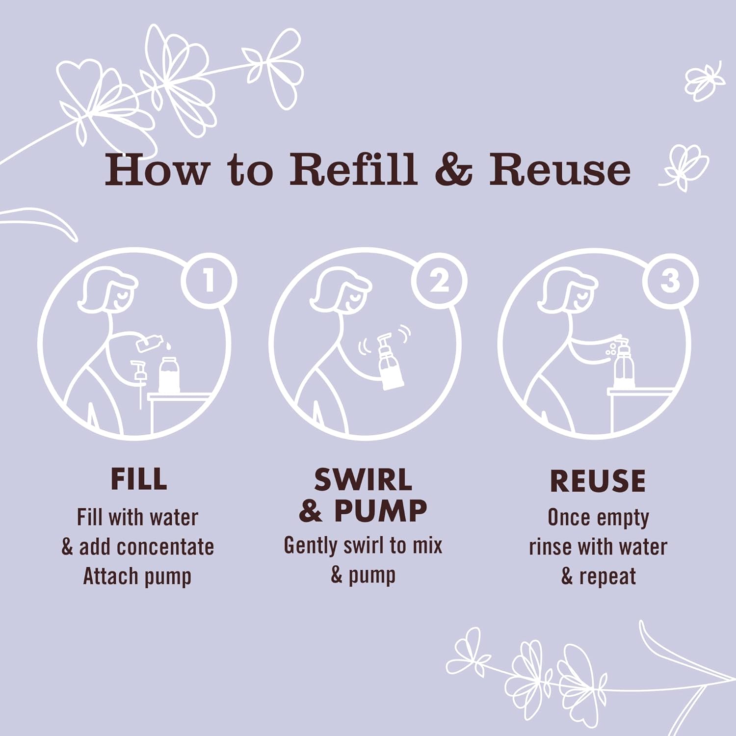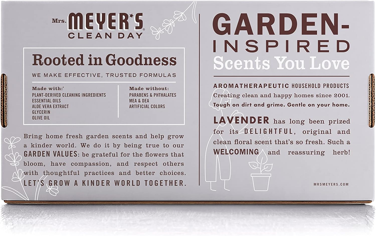 Now available in glass concentrated refillable bottles for less plastic waste. Mrs. Meyerâs Clean Day Foaming Hand Soap refills are specifically made to clean and freshen hands without over drying, while also providing a special, singular scent for your home. Lavender scented hand soap has a fragrance so original and clean with a Garden-inspired floral scent. Such a pretty and reassuring herb! This hardworking foaming hand soap contains a special formula of plant derived cleaning agents, olive oil, aloe vera, essential oils, and other thoughtfully chosen ingredients that clean and freshen hands. Our 2 oz concentrated refill is equal to 1 full hand soap using our 10 oz reusable glass or plastic bottles. Requires dilution for use. Make washing up fun and easy for the whole family! Mrs. Meyerâs â Rooted in Goodness. Includes 4 refills for 4 full Foaming Hand Soaps,Mrs. Meyer's Clean Day 2 oz Concentrated Refill is equal to 1 full Foaming Hand Soap using our 10 oz reusable glass or plastic bottles. This 4 count equals 4 full Foaming Hand Soaps,Concentrated liquid hand soap made with essential oils, aloe vera, olive oil, and other thoughtfully chosen ingredients,Garden-inspired Lavender Foaming Hand Soap has an original and clean floral scent. Such a pretty and reassuring herb,Hand Soap made without parabens, phthalates or artificial colors,Mrs. Meyer's products are made with cruelty-free formulas and are Leaping Bunny certified,Moisturizing hand soap that softens busy and hardworking hands