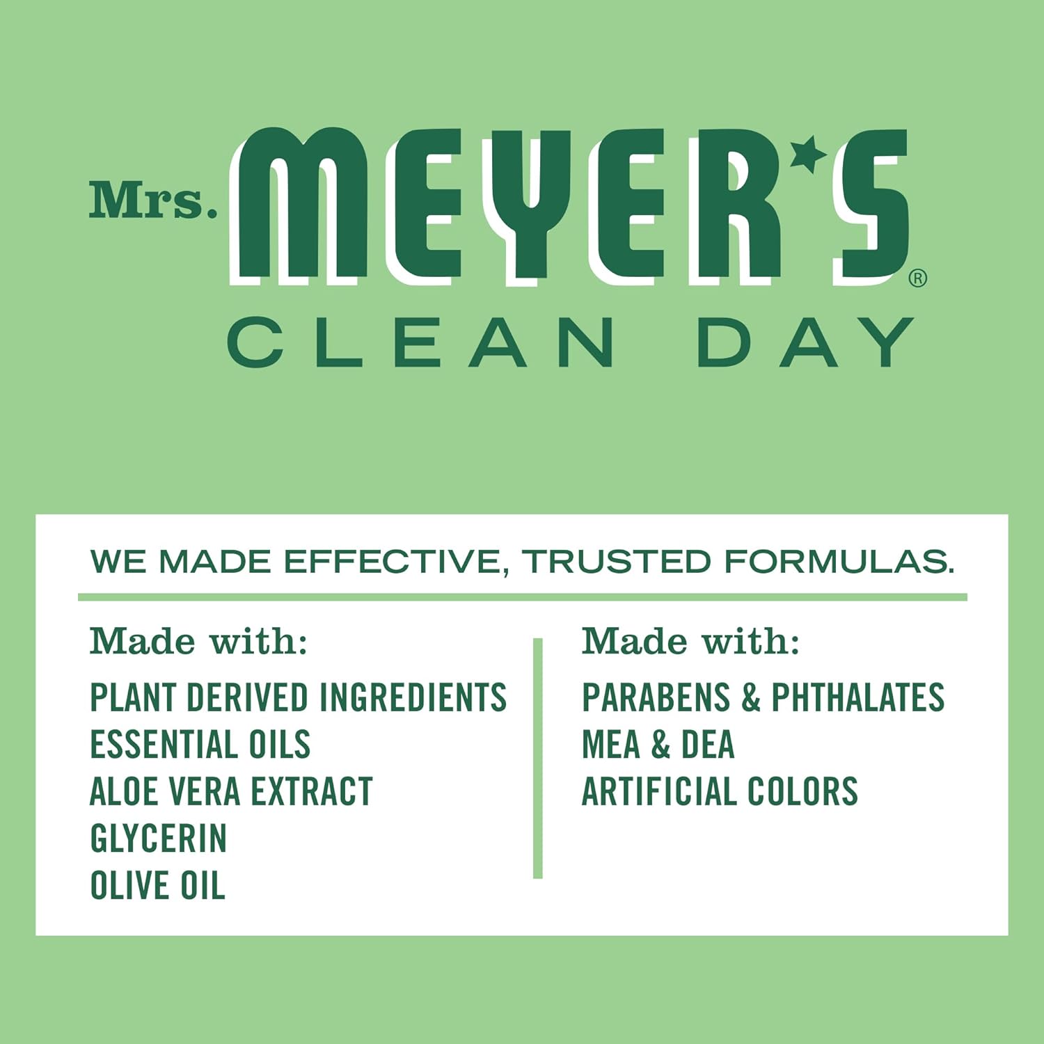 About this item Hardworking Cucumber scented soap for busy hands Liquid hand soap made with essential oils, aloe vera, olive oil, and other thoughtfully chosen ingredients CRISP & juicy, the CUCUMBER is a wholesome, home-grown hero. COOL as can be with a scent like a clean, GREEN garden breeze. Hand Soap made without parabens, phthalates or artificial colors Mrs. Meyer's products are made with cruelty-free formulas and are Leaping Bunny certified Moisturizing hand soap that softens busy and hardworking hands › See more product details,Hardworking Cucumber scented soap for busy hands,Liquid hand soap made with essential oils, aloe vera, olive oil, and other thoughtfully chosen ingredients,CRISP & juicy, the CUCUMBER is a wholesome, home-grown hero. COOL as can be with a scent like a clean, GREEN garden breeze,Hand Soap made without parabens, phthalates or artificial colors,Mrs. Meyer's products are made with cruelty-free formulas and are Leaping Bunny certified,Moisturizing hand soap that softens busy and hardworking hands