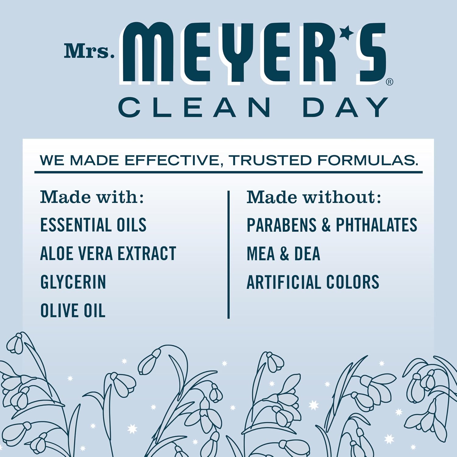 About this item Hardworking Snowdrop soap refill for busy hands Liquid hand soap made with essential oils, aloe vera, olive oil, and other thoughtfully chosen ingredients Special seasonal scent that is fresh and clean, Snowdrop features the sweetness of orange and mandarin mixed with white grapefruit and the cool florals of iced petunia Hand soap made without parabens, phthalates or artificial colors Mrs. Meyer's products are made with cruelty-free formulas and are Leaping Bunny certified Moisturizing hand soap that softens busy and hardworking hands › See more product details,Hardworking Snowdrop soap refill for busy hands,Liquid hand soap made with essential oils, aloe vera, olive oil, and other thoughtfully chosen ingredients,Special seasonal scent that is fresh and clean, Snowdrop features the sweetness of orange and mandarin mixed with white grapefruit and the cool florals of iced petunia,Hand soap made without parabens, phthalates or artificial colors,Mrs. Meyer's products are made with cruelty-free formulas and are Leaping Bunny certified,Moisturizing hand soap that softens busy and hardworking hands
