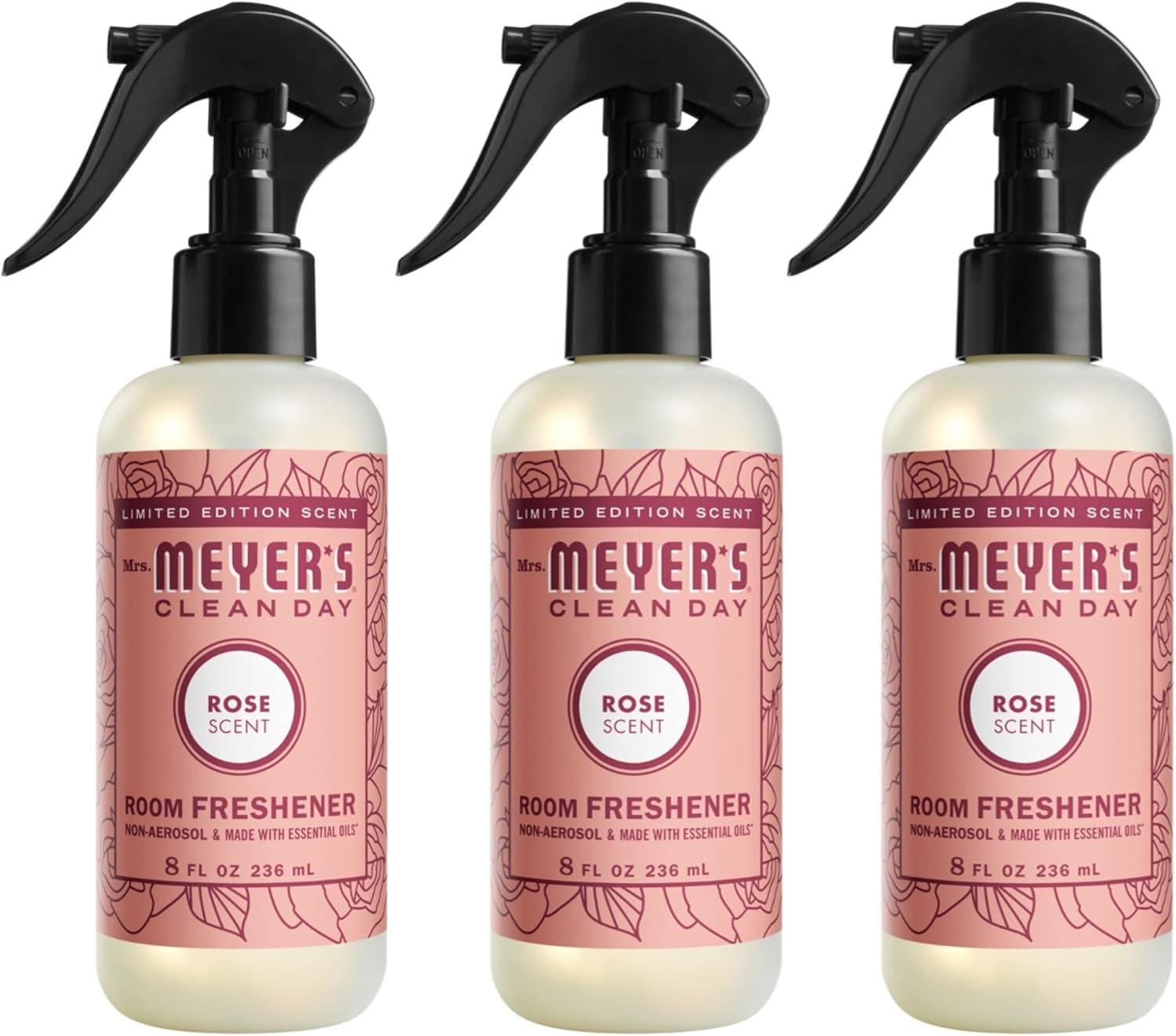 Mrs. Meyer's Clean Day Room Fresheners are specifically made to quickly freshen any room, while also providing a special, singular scent for your home. Rose room spray, a beloved garden bloom made modern for Spring. Touches of crisp green apple and pulpy stone fruits all sprinkled with watery freshness by any other name, still a rose. The non-aerosol bottle quickly freshens any room for instant fragrance. This room freshener is made with essential oils and other thoughtfully chosen ingredients. Perfect for when you need to add a little garden-inspired fragrance to your home between cleaning days. Made without propellants, phthalates, parabens, or artificial colors - and of course, always a cruelty free formula room air freshener. Bottles (less trigger) made with at least 30% post-consumer plastic. Also available in other garden-inspired scents and products such as candles, laundry detergent, dish packs, and so much more! Mrs. Meyer's - Rooted in Goodness,Mrs. Meyer’s Clean Day Rose air freshener spray is made with essential oils and other thoughtfully chosen ingredients, and gives your home instant freshening between cleaning days,Delivered in a non-aerosol spray to quickly freshen any room,Mrs. Meyer's products are made with cruelty-free formulas and are Leaping Bunny certified,Rose air freshener, a beloved garden bloom made modern for Spring. Touches of crisp green apple and pulpy stone fruits all sprinkled with watery freshness by any other name, still a rose,Mrs. Meyer's air freshener for home has thoughtfully chosen ingredients and is made without propellants, phthalates, parabens, or artificial colors