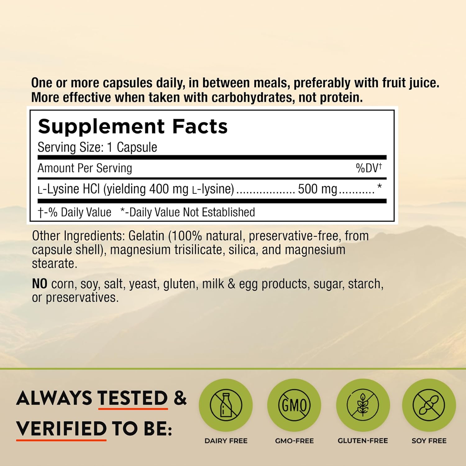 Clean, Quality Ingredients, MADE IN THE USA. Pharmaceutical-grade L-Lysine in a vegan capsule. Non-GMO, gluten-free, dairy-free, soy-free, and made without artificial preservatives