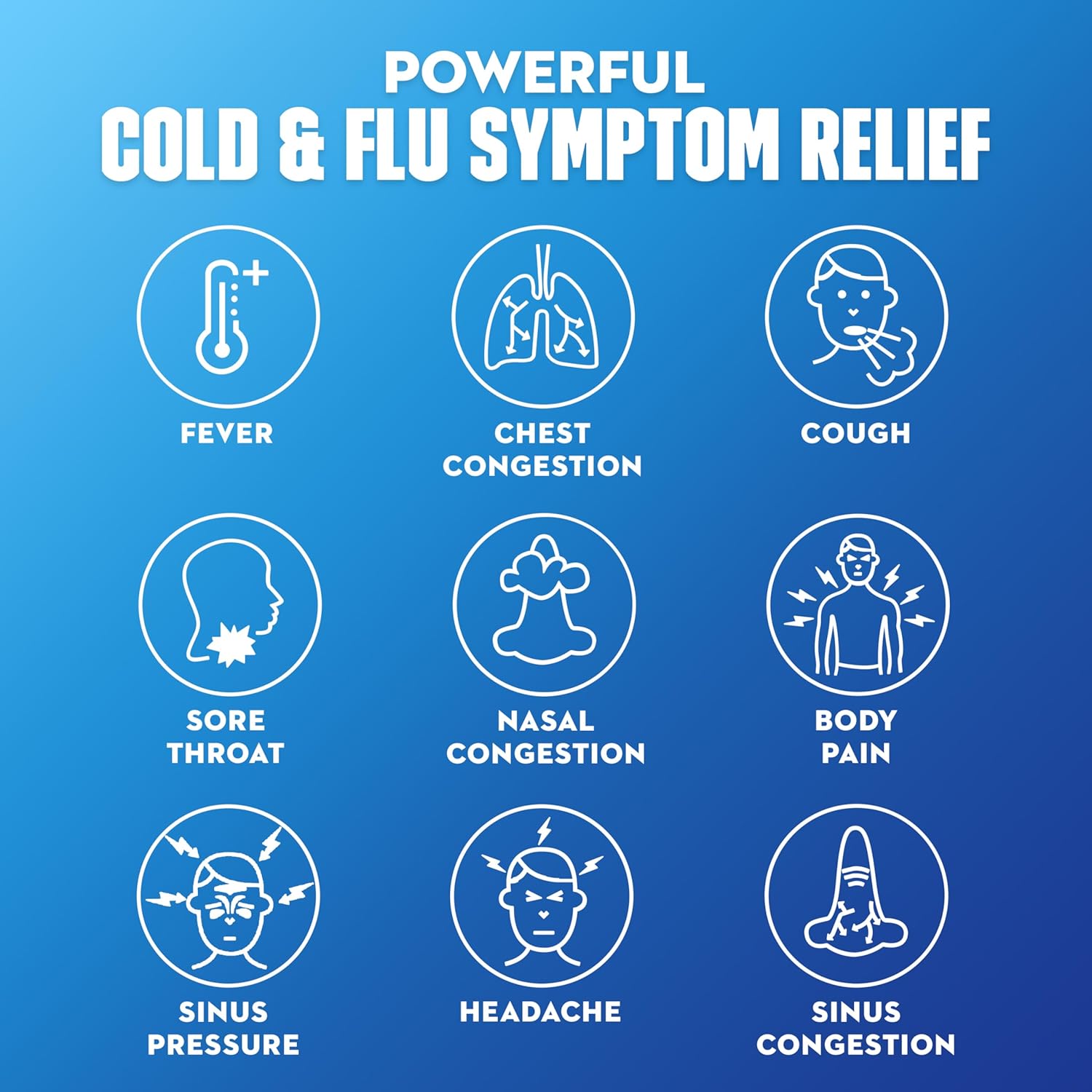 MAXIMUM STRENGTH RELIEF: Maximum Strength Mucinex Fast-Max Cold, Flu & Sore Throat helps reduce fever, relieve cough, sore throat, stuffy nose, chest & nasal congestion, headache and minor aches and pains