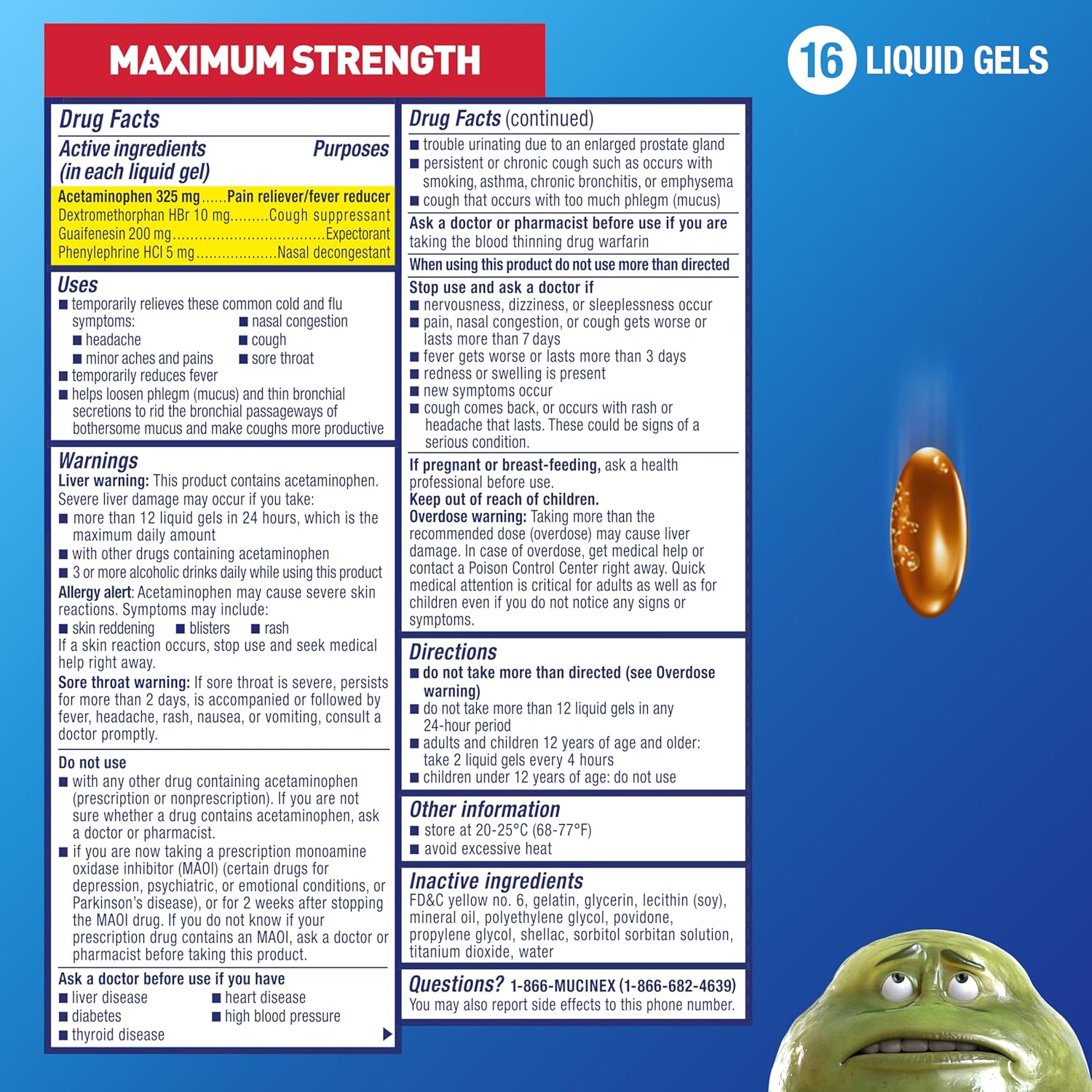 About this item MAXIMUM STRENGTH RELIEF: Maximum Strength Mucinex Fast-Max Cold, Flu & Sore Throat helps reduce fever, relieve cough, sore throat, stuffy nose, chest & nasal congestion, headache and minor aches and pains #1 TRUSTED COUGH & COLD: #1 Cough & Cold Brand Doctors Trust* and #1 Pharmacist Recommended Brand PAIN RELIEVER: Contains Acetaminophen which reduces fever and relieves minor aches and pains thereby relieving your sore throat pain COUGH SUPPRESSANT: Contains Dextromethorphan HBr that helps relieve cough EXPECTORANT: Contains Guaifenesin that thins and loosens mucus; relieves chest congestion › See more product details,MAXIMUM STRENGTH RELIEF: Maximum Strength Mucinex Fast-Max Cold, Flu & Sore Throat helps reduce fever, relieve cough, sore throat, stuffy nose, chest & nasal congestion, headache and minor aches and pains,#1 TRUSTED COUGH & COLD: #1 Cough & Cold Brand Doctors Trust* and #1 Pharmacist Recommended Brand,PAIN RELIEVER: Contains Acetaminophen which reduces fever and relieves minor aches and pains thereby relieving your sore throat pain,COUGH SUPPRESSANT: Contains Dextromethorphan HBr that helps relieve cough,EXPECTORANT: Contains Guaifenesin that thins and loosens mucus; relieves chest congestion