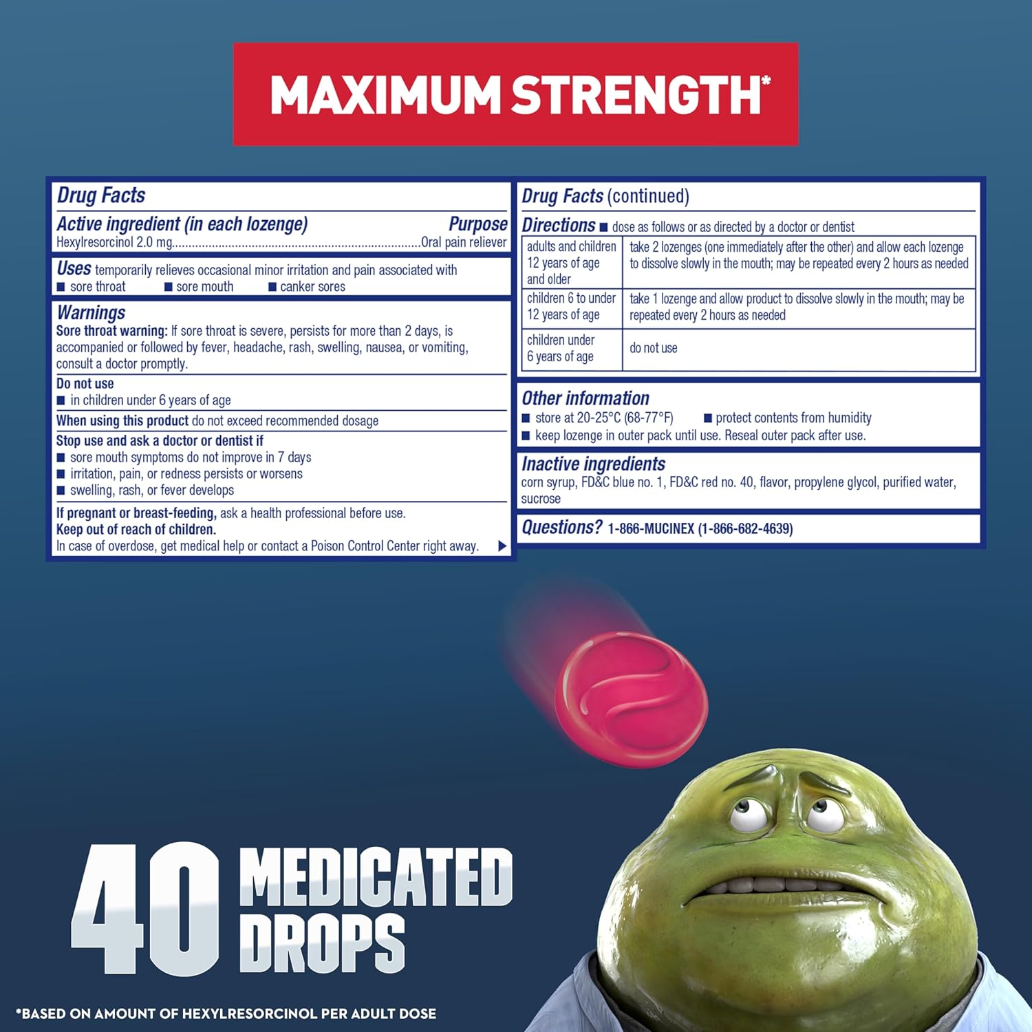 About this item MUCINEX SORE THROAT RELIEF: These sore throat drops provide soothing comfort and temporarily relieve occasional minor irritation and pain associated with sore throat, sore mouth, and canker sores FAST ACTING SORE THROAT LOZENGES: Mucinex Instasoothe Sore Throat Drops provide rapid relief that lasts up to 2 hours HONEY & ECHINACEA FLAVOR SORE THROAT DROPS: These echinacea & honey flavored sore throat medicated drops are powered by a unique formula containing hexylresorcinol, not menthol like other cough drops; Use as directed ON-THE-GO SORE THROAT RELIEF: Each Mucinex sore throat drop is individually wrapped & sealed for your convenience, so you don't have to worry about them unwrapping & sticking in your pocket or bag BE PREPARED FOR COLD & FLU SEASON: Mucinex has a wide range of cough, cold and flu health care products to help your family get through cold & flu season, such as cough drops, sore throat spray, cold medicine, and cough medicine TRUSTED BRAND: Mucinex is the #1 Cough & Cold Brand Doctor's Trust* and is also the #1 Pharmacist Recommended Brand** so you can feel confident choosing Mucinex this cold & flu season FSA & HSA Eligible: Save Up to 30%; Cover out-of-pocket expenses with pre-tax dollars; Product eligibility may vary by plan, check with your benefits administrator to determine which expenses are eligible before you shop *IQVIA using ProVoice Survey, August 2023; **U.S. News & World Report/Pharmacy Times 2023-2024 › See more product details,MUCINEX SORE THROAT RELIEF: These sore throat drops provide soothing comfort and temporarily relieve occasional minor irritation and pain associated with sore throat, sore mouth, and canker sores,FAST ACTING SORE THROAT LOZENGES: Mucinex Instasoothe Sore Throat Drops provide rapid relief that lasts up to 2 hours,HONEY & ECHINACEA FLAVOR SORE THROAT DROPS: These echinacea & honey flavored sore throat medicated drops are powered by a unique formula containing hexylresorcinol, not menthol like other cough drops; Use as directed,ON-THE-GO SORE THROAT RELIEF: Each Mucinex sore throat drop is individually wrapped & sealed for your convenience, so you don't have to worry about them unwrapping & sticking in your pocket or bag,BE PREPARED FOR COLD & FLU SEASON: Mucinex has a wide range of cough, cold and flu health care products to help your family get through cold & flu season, such as cough drops, sore throat spray, cold medicine, and cough medicine,TRUSTED BRAND: Mucinex is the #1 Cough & Cold Brand Doctor's Trust* and is also the #1 Pharmacist Recommended Brand** so you can feel confident choosing Mucinex this cold & flu season,FSA & HSA Eligible: Save Up to 30%; Cover out-of-pocket expenses with pre-tax dollars; Product eligibility may vary by plan, check with your benefits administrator to determine which expenses are eligible before you shop,*IQVIA using ProVoice Survey, August 2023; **U.S. News & World Report/Pharmacy Times 2023-2024