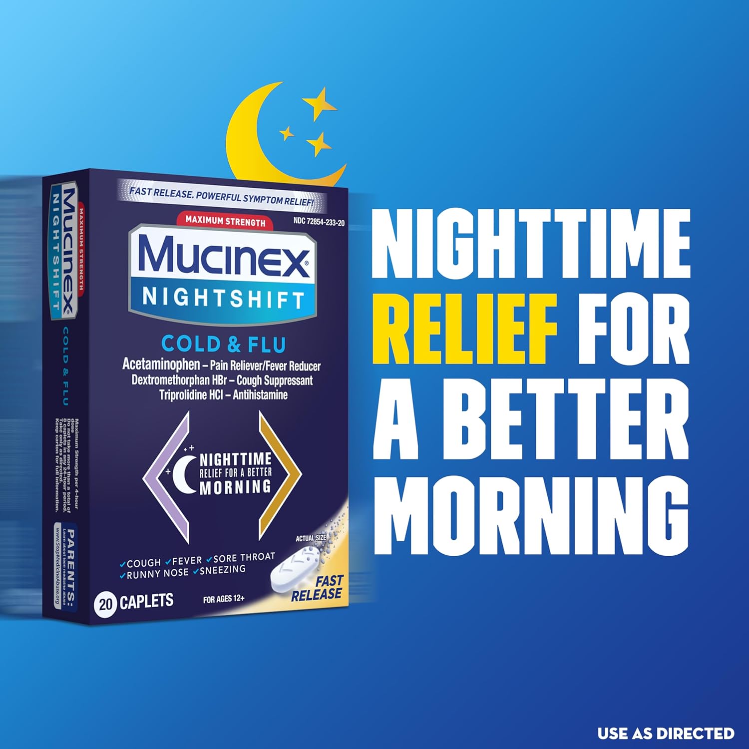 Mucinex Nightshift Cold & Flu, Maximum Strength Powerful Multi-Symptom Nighttime Relief, 20 Fast Release Caplets - Pain Reliever/Fever Reducer, Cough Suppressant, Antihistamine