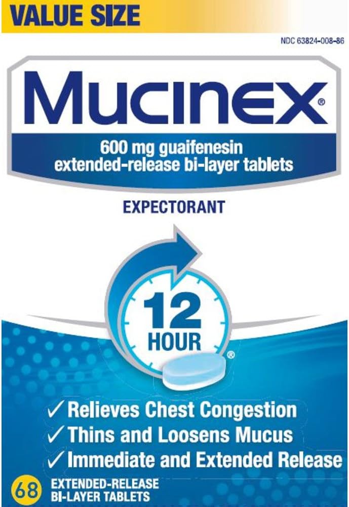 About this item MUCINEX CHEST CONGESTION MEDICINE: Clinically proven to last up to 12 hours and provide relief for your chest congestion and make cough more productive POWERFUL SYMPTOM RELIEF: Mucinex 12 hour relieves chest congestion and thins and loosens mucus BI-LAYER TABLET: A unique bi-layer tablet, one layer for immediate release and one layer for extended release so the medicine starts to release right away and last for up to 12 hours #1 TRUSTED COLD & COUGH BRAND: #1 Cold and Cough brand doctors trust* and #1 Pharmacist Recommended Brand CONTINUOUS RELIEF: Mucinex lasts up to 12 hours so you can say goodbye to retaking medicine every 4 hours ACTIVE INGREDIENT: Contains Guaifenesin which is an expectorant that relieves chest congestion and thins & loosens mucus making cough more productive USAGE: Use as directed; Adults and Children 12 years of age and over › See more product details,MUCINEX CHEST CONGESTION MEDICINE: Clinically proven to last up to 12 hours and provide relief for your chest congestion and make cough more productive,POWERFUL SYMPTOM RELIEF: Mucinex 12 hour relieves chest congestion and thins and loosens mucus,BI-LAYER TABLET: A unique bi-layer tablet, one layer for immediate release and one layer for extended release so the medicine starts to release right away and last for up to 12 hours,#1 TRUSTED COLD & COUGH BRAND: #1 Cold and Cough brand doctors trust* and #1 Pharmacist Recommended Brand,CONTINUOUS RELIEF: Mucinex lasts up to 12 hours so you can say goodbye to retaking medicine every 4 hours,ACTIVE INGREDIENT: Contains Guaifenesin which is an expectorant that relieves chest congestion and thins & loosens mucus making cough more productive,USAGE: Use as directed; Adults and Children 12 years of age and over