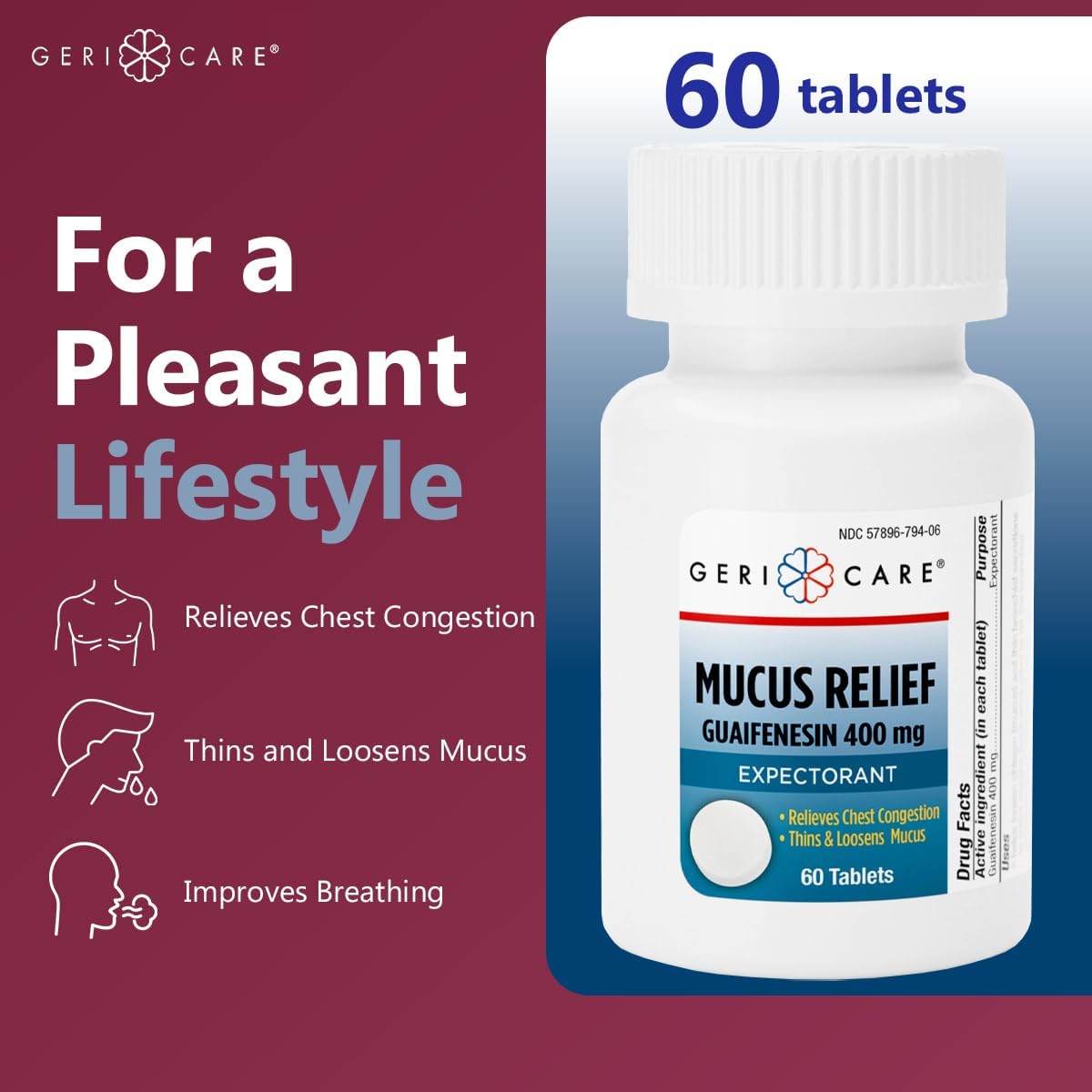 Mucus Relief Tablets By Geri-Care | Expectorant For Chest Congestion Relief | Guaifenesin 400Mg | 60 Count Bottle