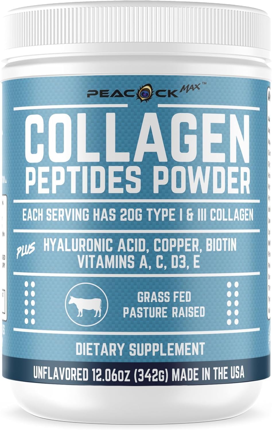 About this item Clean, Natural, and Trustworthy: Peacock Max Collagen Peptides Powder is made in the USA and is free from artificial colors, flavors, preservatives, gluten, soy, dairy, peanuts, and shellfish. Designed with a focus on purity and quality, it contains no added sugars, making it suitable for keto-friendly and clean eating lifestyles. Amino Acids for Everyday Energy: Rich in amino acids such as glycine, proline, and hydroxyproline, this collagen powder delivers premium quality nutrients for those seeking a wholesome addition to their diet. Its unflavored formula ensures seamless blending into any beverage or dish. Convenient and Easy to Use: With 20 servings per container, this unflavored collagen powder is ideal for adding to smoothies, protein shakes, coffee, or even recipes. Enjoy a product designed to fit effortlessly into your busy lifestyle. Crafted for a Balanced Lifestyle: Peacock Max Collagen Peptides Powder is a grass-fed, pasture-raised formula with a commitment to high standards. Designed to complement modern lifestyles, it offers a high-quality, convenient option for those looking to enhance their daily nutrition. See more product details,Clean, Natural, and Trustworthy: Peacock Max Collagen Peptides Powder is made in the USA and is free from artificial colors, flavors, preservatives, gluten, soy, dairy, peanuts, and shellfish. Designed with a focus on purity and quality, it contains no added sugars, making it suitable for keto-friendly and clean eating lifestyles,Amino Acids for Everyday Energy: Rich in amino acids such as glycine, proline, and hydroxyproline, this collagen powder delivers premium quality nutrients for those seeking a wholesome addition to their diet. Its unflavored formula ensures seamless blending into any beverage or dish,Convenient and Easy to Use: With 20 servings per container, this unflavored collagen powder is ideal for adding to smoothies, protein shakes, coffee, or even recipes. Enjoy a product designed to fit effortlessly into your busy lifestyle,Crafted for a Balanced Lifestyle: Peacock Max Collagen Peptides Powder is a grass-fed, pasture-raised formula with a commitment to high standards. Designed to complement modern lifestyles, it offers a high-quality, convenient option for those looking to enhance their daily nutrition