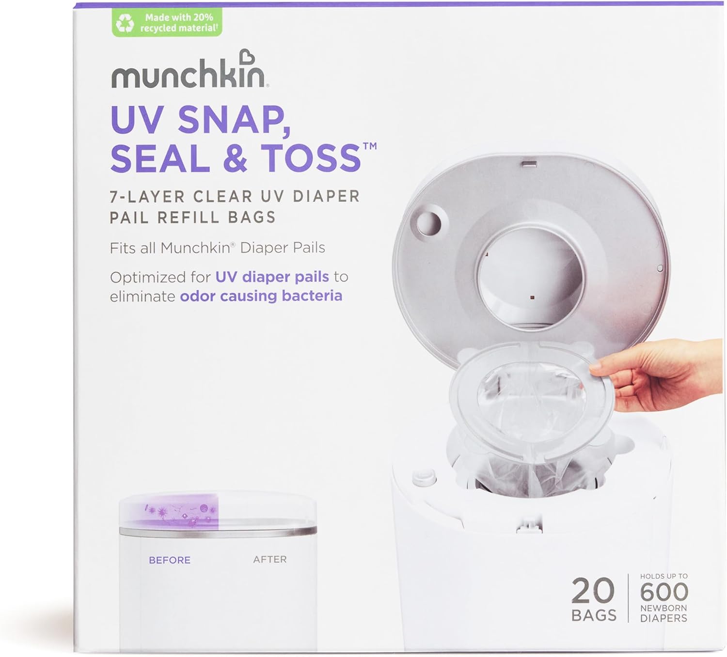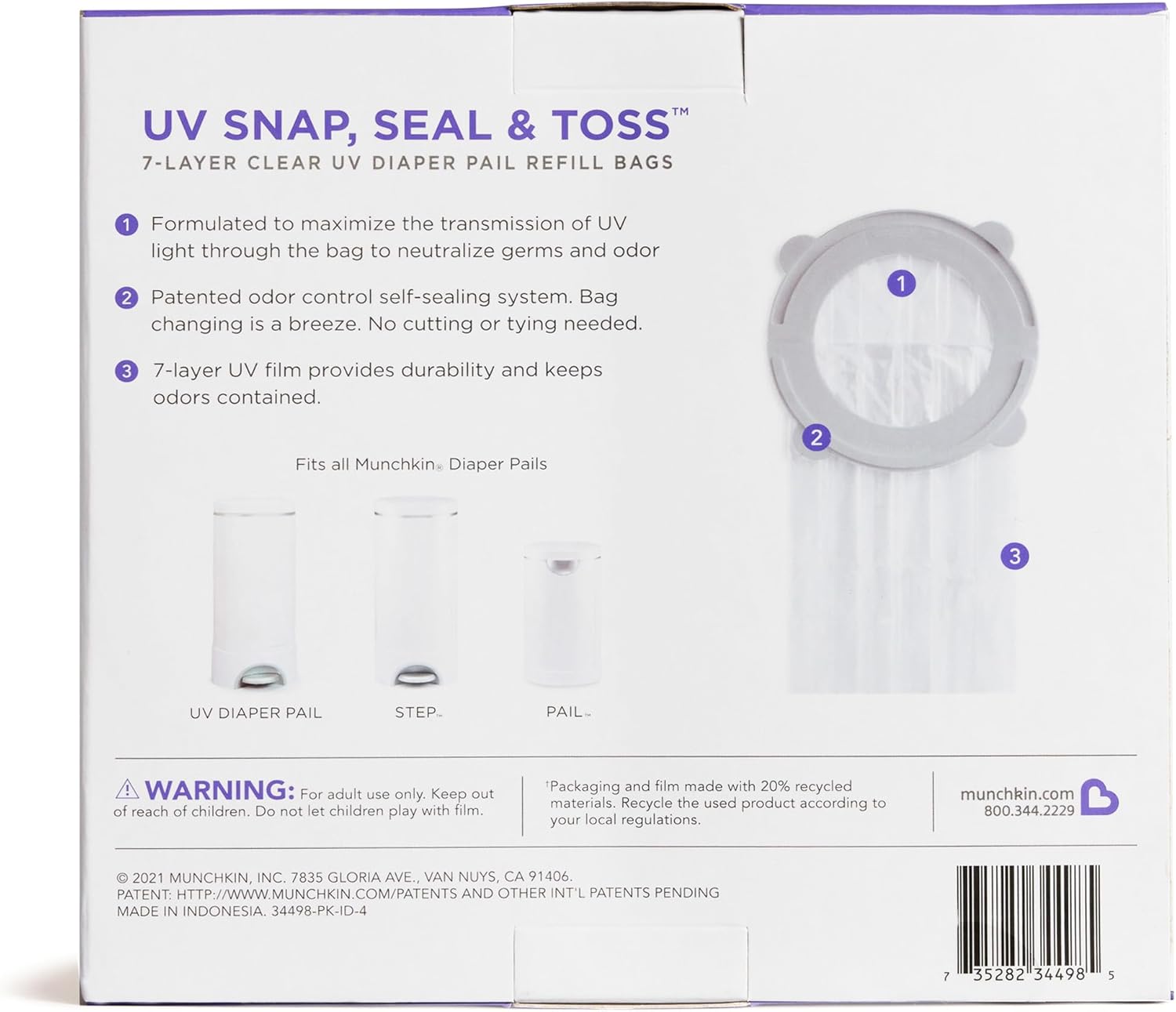 Our Uv Snap, Seal & Toss Diaper Pail Refill Bags Make Disposing Dirty Diapers A Breeze. Optimized For The Uv Diaper Pail, But Compatible With All Munchkin Diaper Pails. These Bags Are Made With 7 Clear Layers Of Film To Provide Extra Durability And Odor Control. The Patented Self-Sealing System Does An Excellent Job Of Keeping Smells Contained – And When Used With The Uv Diaper Pail, The Film Helps Maximize The Transmission Of Uv Light