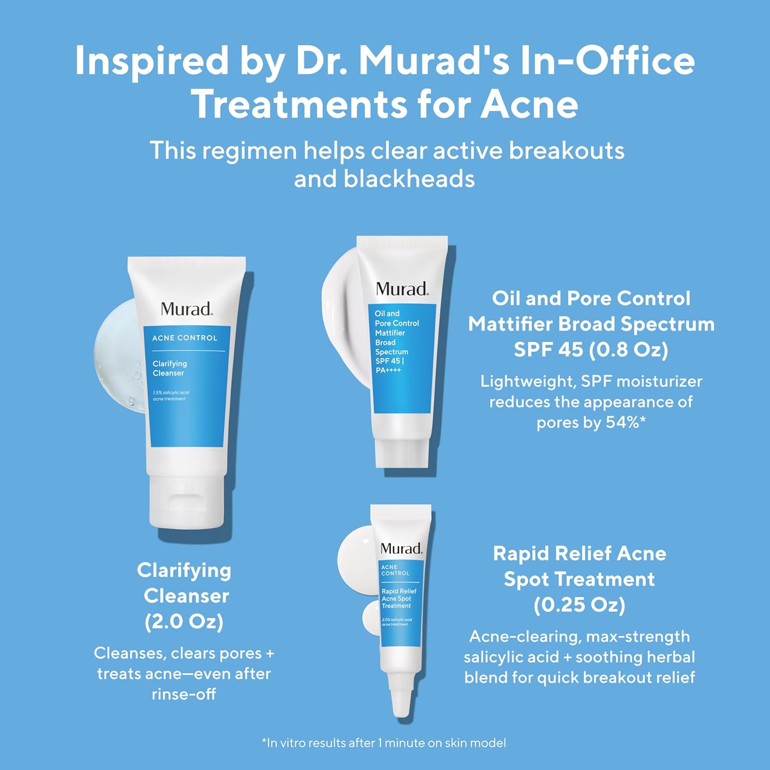 Murad Acne Trial Kit - Clear Breakouts + Control Oil 3-Piece Trial Kit ($50 Value) - Clarifying Cleanser 2Fl Oz, Rapid Relief Acne Treatment 0.25Fl Oz, Oil & Pore Mattifer Spf 45 0.8Fl Oz