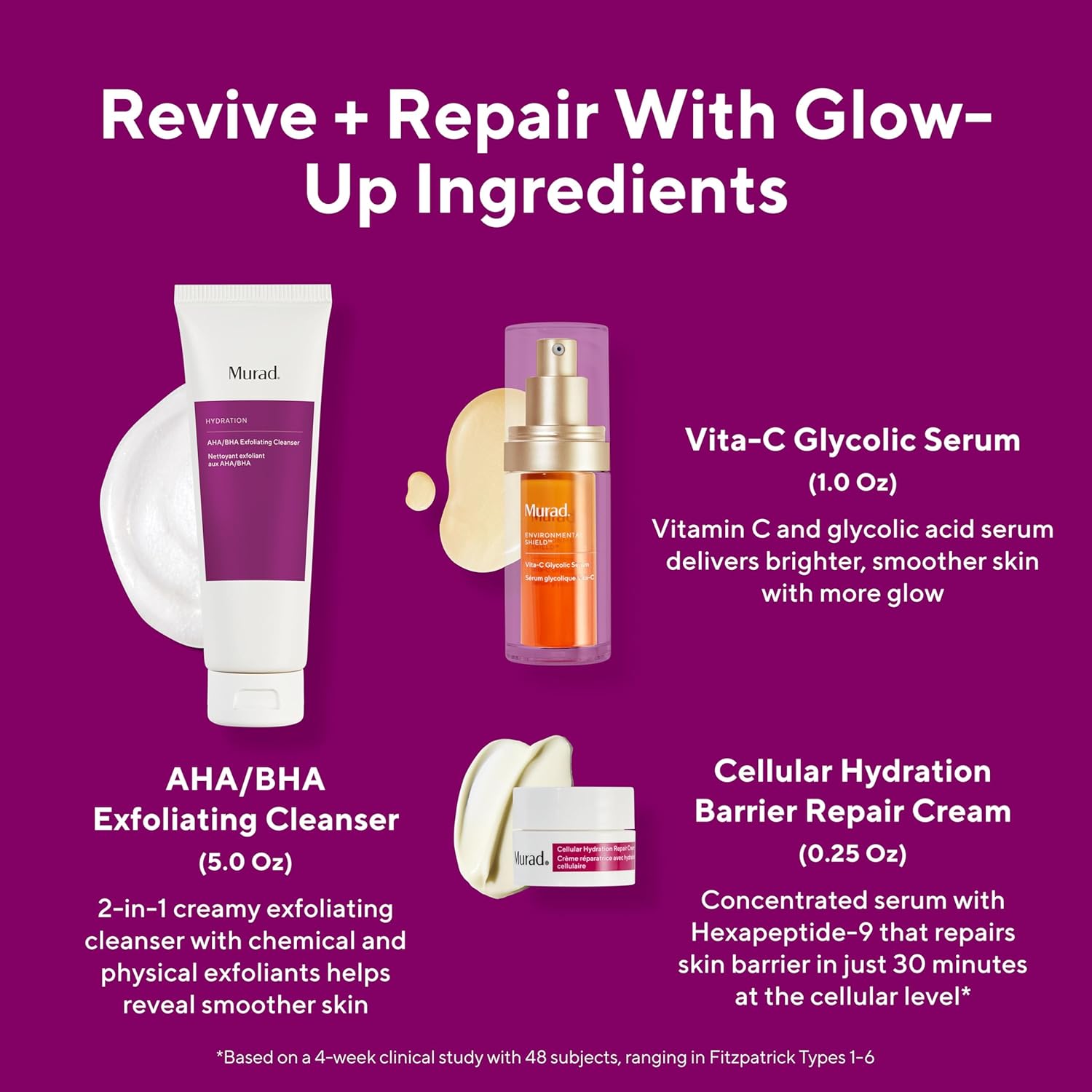 Murad Revive + Repair w/Glow Up Ingredients - 3-Piece Set ($135 Value) - Regimen for Total Skin Health - AHA/BHA Cleanser 5.0Fl Oz, Glycolic Serum 1.0Fl Oz, Cellular Hydration Cream 0.25Fl Oz