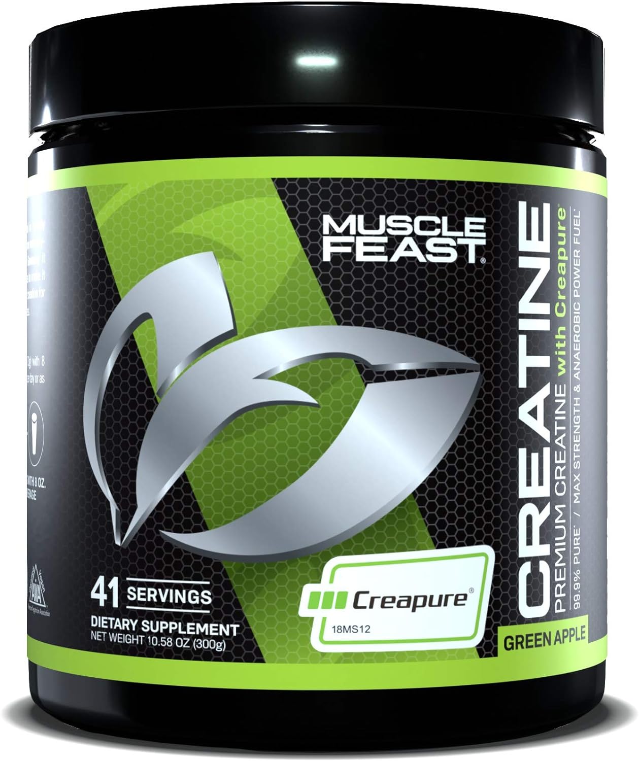 Muscle Feast Creapure Creatine Monohydrate Powder, Vegan Keto Friendly Gluten-Free Easy To Mix, Mass Gainer, Muscle Recovery Supplement And Best Creatine For Muscle Growth, Green Apple, 300G