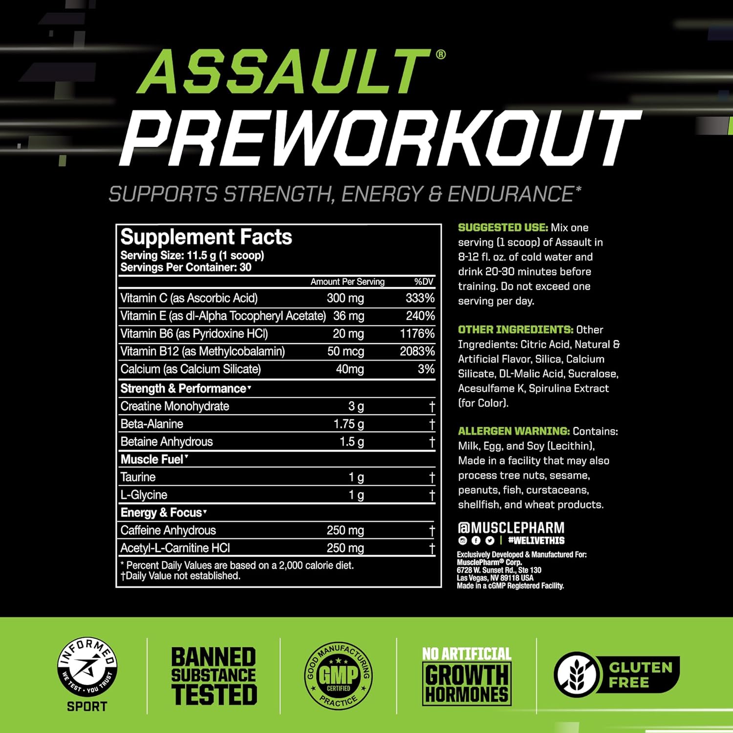 About this item Explosive Energy & Strength: MusclePharm Assault Sport Pre Workout Powder is engineered for those who seek an edge in their workout regimen. Packed with potent ingredients like Beta Alanine, Caffeine, Creatine and more, it’s the ultimate pre workout for enhanced endurance and reduced muscle fatigue. The Athlete's Pre Workout: A game-changing formula for your routine, delivering noticeable improvements in performance, energy, and focus with 250mg Caffeine Anhydrous, 3g Creatine Monohydrate, 1.75g Beta-Alanine, 1.5g Betaine Anhydrous, 1g Taurine, 1g L-Glycine, 250mg Acetyl-L-Carnitine per serving. Tastes Great & Mixes Easily: 30 servings of mouthwatering Blue Raspberry pre workout, tastes great so you'll enjoy this power boost. Mix with cold water & take 20-30 mins before training. Crafted by Experts, Delivered with Excellence: Assault Pre Workout Powder for Men & Women has zero calories, carbs, and contains no artificial dyes or gluten. It is banned substance tested and certified by Informed-Choice, so athletes can take it with confidence. Unleash Your Potential: Our mission is to fuel the relentless pursuit of greatness among athletes. Our cutting-edge, science-backed formulas optimize physical performance, enhance recovery, and ensure you have the tools you need to conquer new heights and redefine your limits. See more product details,Explosive Energy & Strength: MusclePharm Assault Sport Pre Workout Powder is engineered for those who seek an edge in their workout regimen. Packed with potent ingredients like Beta Alanine, Caffeine, Creatine and more, it’s the ultimate pre workout for enhanced endurance and reduced muscle fatigue,The Athlete's Pre Workout: A game-changing formula for your routine, delivering noticeable improvements in performance, energy, and focus with 250mg Caffeine Anhydrous, 3g Creatine Monohydrate, 1.75g Beta-Alanine, 1.5g Betaine Anhydrous, 1g Taurine, 1g L-Glycine, 250mg Acetyl-L-Carnitine per serving,Tastes Great & Mixes Easily: 30 servings of mouthwatering Blue Raspberry pre workout, tastes great so you'll enjoy this power boost. Mix with cold water & take 20-30 mins before training,Crafted by Experts, Delivered with Excellence: Assault Pre Workout Powder for Men & Women has zero calories, carbs, and contains no artificial dyes or gluten. It is banned substance tested and certified by Informed-Choice, so athletes can take it with confidence,Unleash Your Potential: Our mission is to fuel the relentless pursuit of greatness among athletes. Our cutting-edge, science-backed formulas optimize physical performance, enhance recovery, and ensure you have the tools you need to conquer new heights and redefine your limits