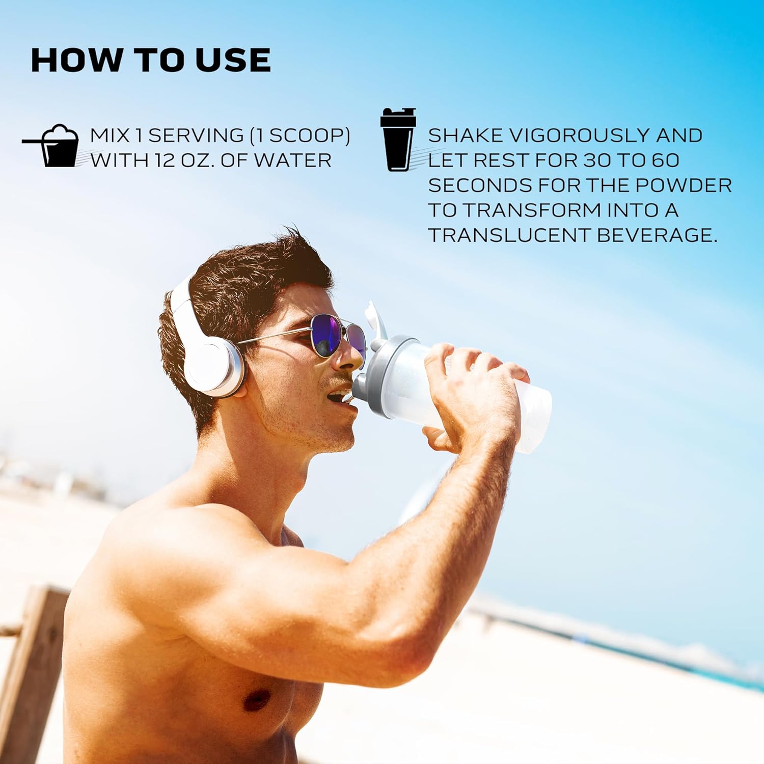Directions: Mix 1 scoop in 12 oz. of water in a shaker cup. Shake vigorously and let rest for 30 to 60 seconds, as the powder transforms into a translucent protein beverage
